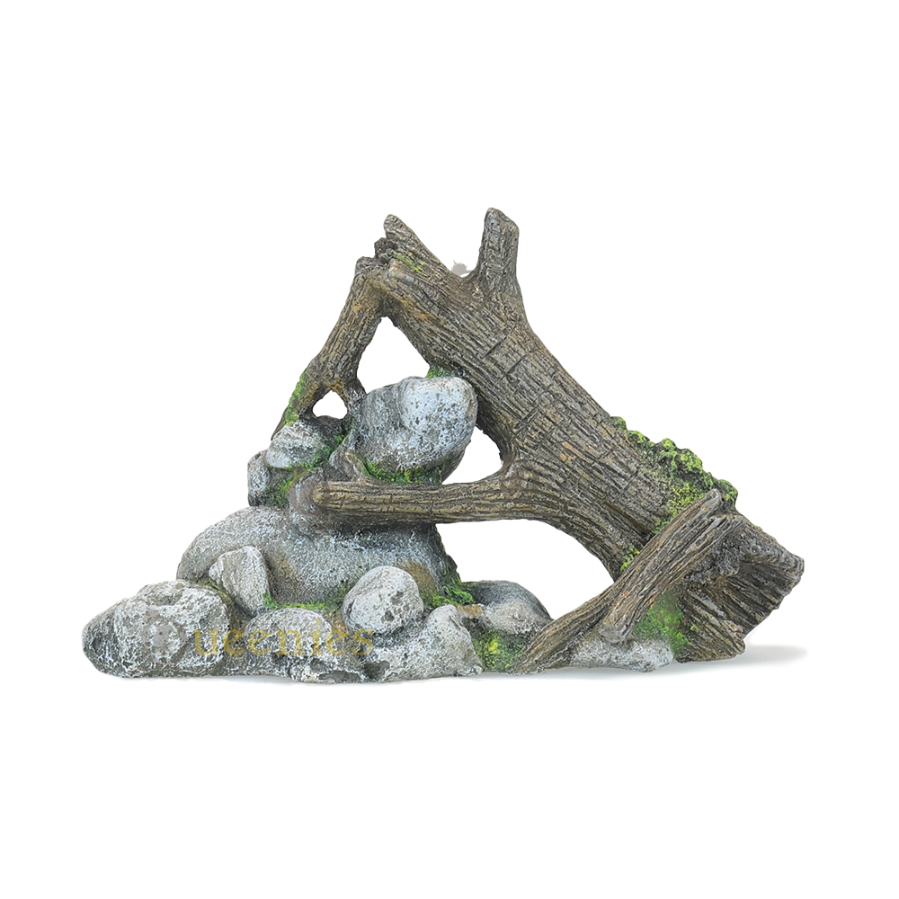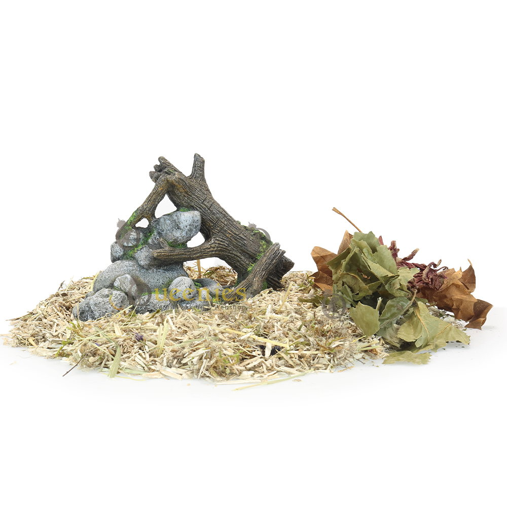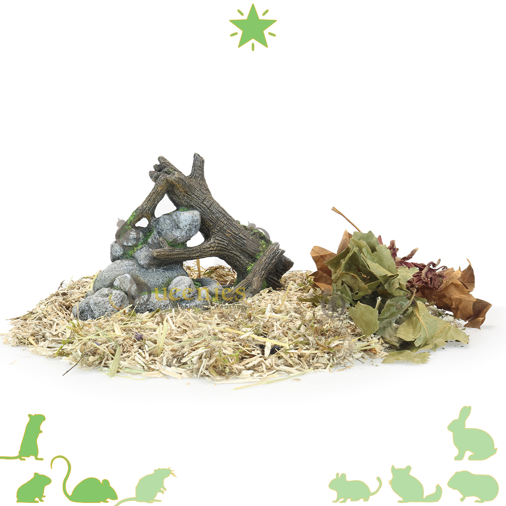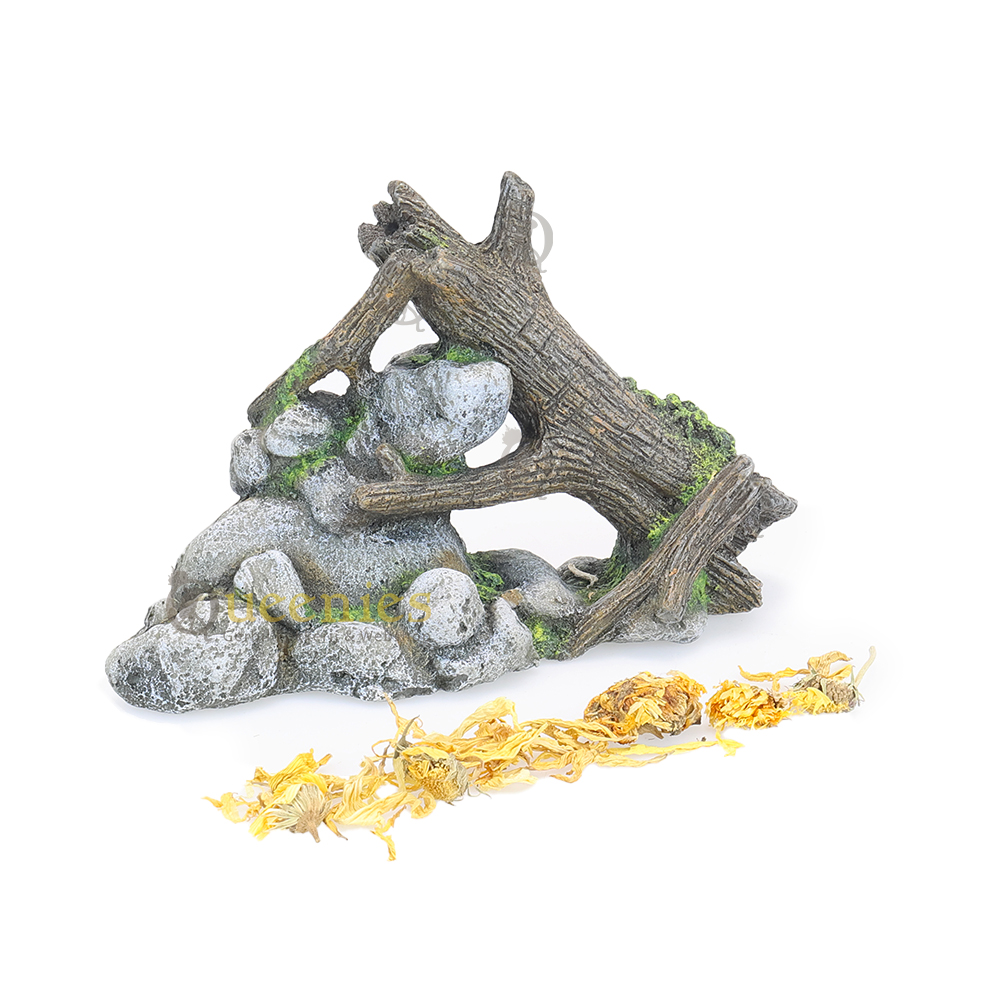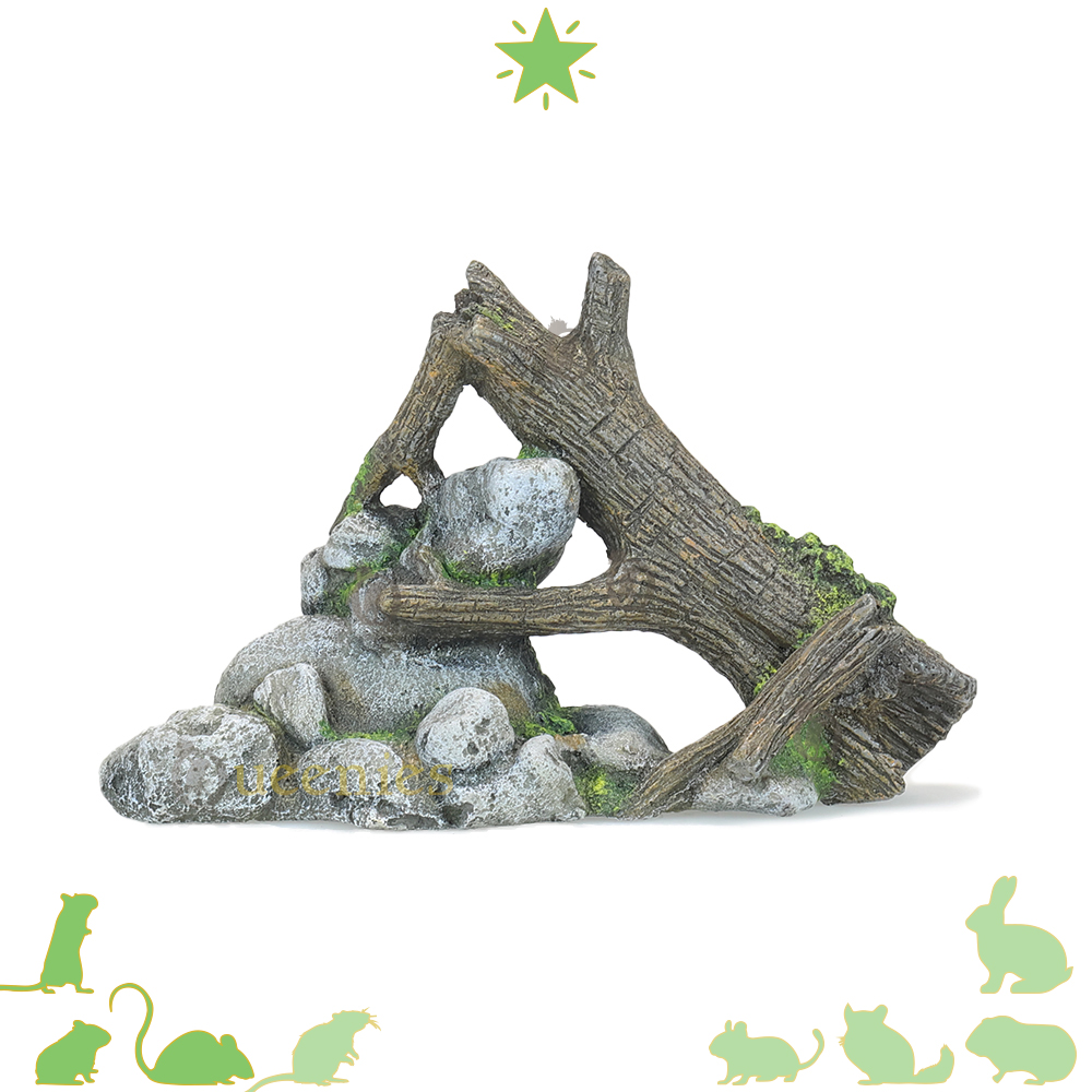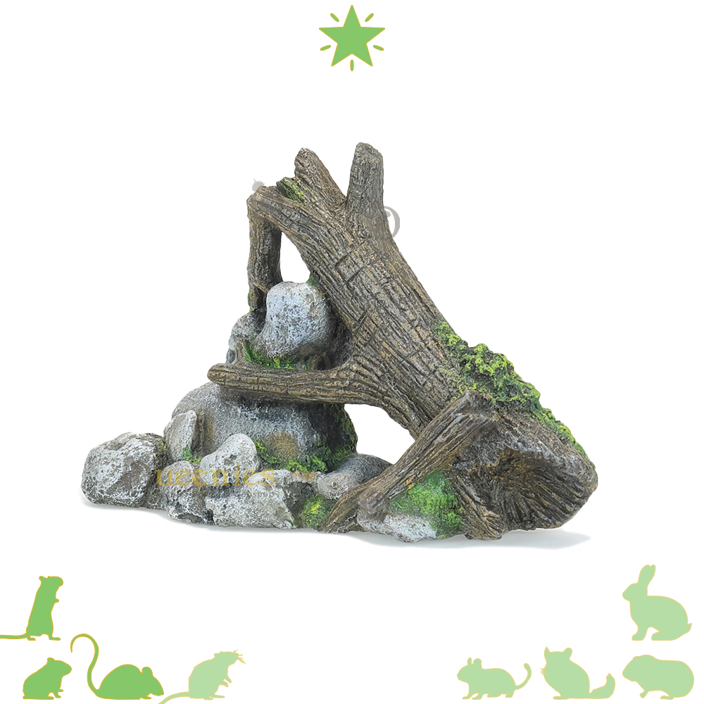 De Rots met hout Boomstam is een goede toevoeging aan een Natuurlijke Hamsterscape inrichting met Kunshars in een Gerbilarium / Hamster Terrarium. De combinatie van natuurlijke elementen maakt het niet alleen een interessante decoratie maar geeft ook een natuurlijke uitstraling aan het Gerbilarium. Als het u het product plaats in het verblijf van de Knaagdieren moet u er voor zorgen dat het goed stevig staat. Gerbils, Hamsters en andere Knaagdieren zijn erg nieuwsgierig en zullen de Rots met hout gaan verkennen. Als de Gerbils boven op het product klimmen moet het natuurlijk niet zomaar om kunnen vallen. De Rost kan verstevigd worden door Terrarium mos of andere bodembedekking eronder te plaatsen waardoor het product minder kan gaan schuiven.
