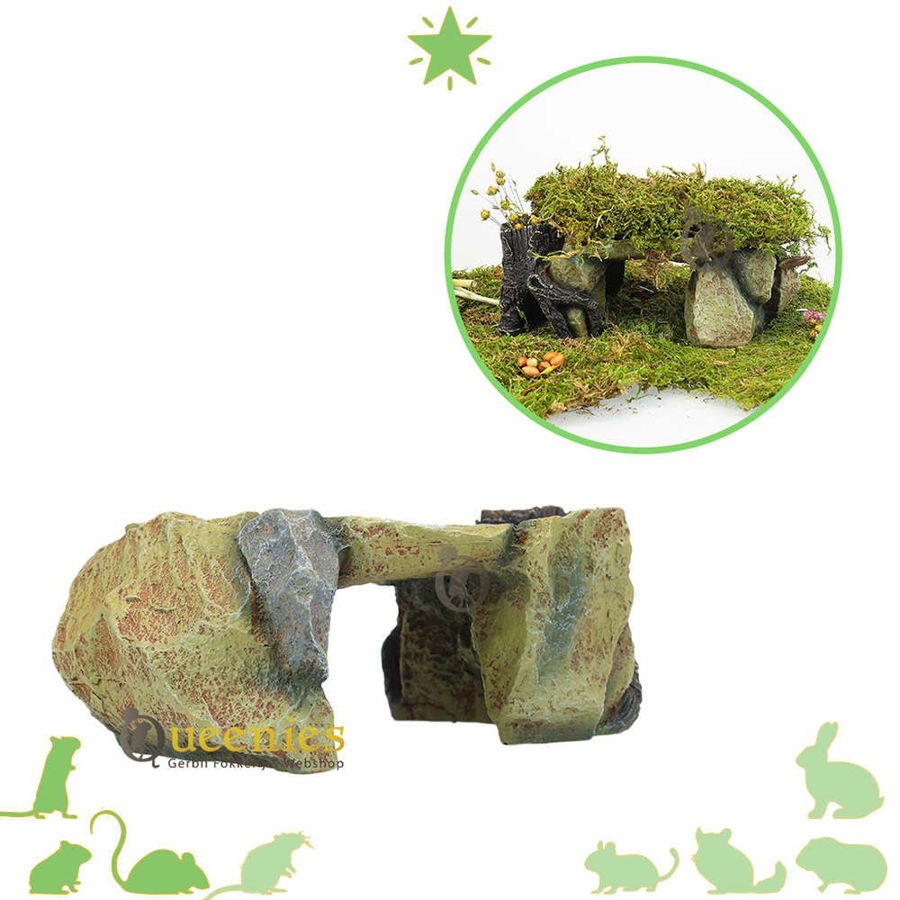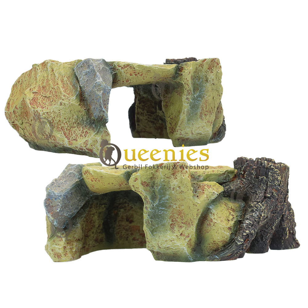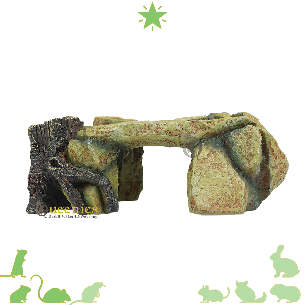Een product wat uit de vissen categrorie komt. Een rotsplateau met boomstam gemaakt van polyesterhars en zeewaterbestendig. Maar, natuurlijk ook ontzettend leuk in een knaagdierenverblijf zonder water maar met zaagsel en andere knaagdier toebehoren ;-) Het oogt natuurlijk, de kleuren sluiten perfect aan bij een mooie hamsterscape of een gerbilscape waarbij de woestijn wordt nagebootst. Het voordeel is dat het niet kapot geknaagd kan worden door gerbils. Rotsplateau met Boomstam Afmetingen Lxbxh: 25x14x8.5