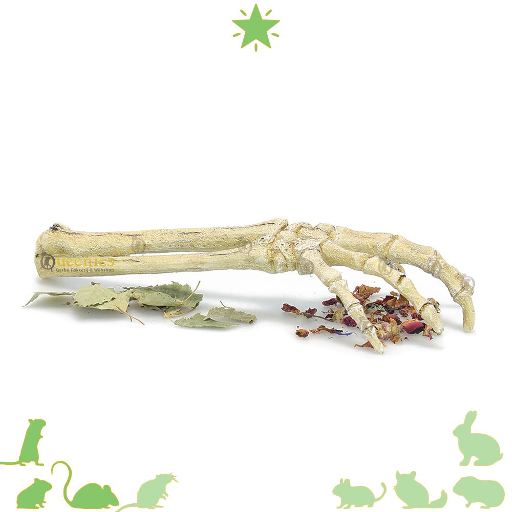 Gerbils kunnen ook gebruik maken van de Skelet hand door erop boven op te klimmen. De nieuwsgierige aard van de dieren zorgt ervoor dat zij al snel op onderzoek uitgaan wat er ongelofelijk leuk uit ziet om een Gerbil boven op de Skelet hand te zien staan. Zoals eerder al een keer genoemd kan er ook eten en snacks onder de Skelet hand verstopt worden. Niet alleen wordt de hand hierdoor interactief, het maakt ook een leuk plaatje.