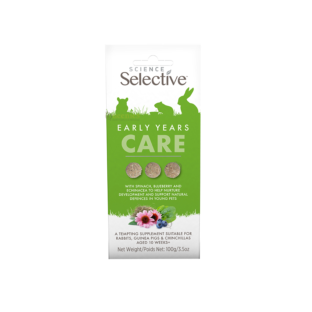 Science Selective Early Years Care Supplements kunnen dagelijks gegeven worden aan jonge konijnen, cavia’s en chinchilla’s vanaf 10 weken oud. Het is een smakelijke en gezonde aanvulling op hun normale voeding, ideaal voor een soepele overgang naar volwassenheid.