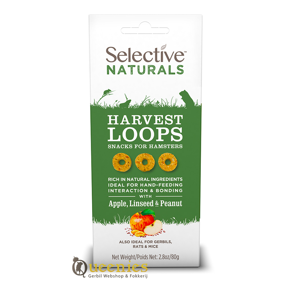 Naast de dagelijkse voederkorrels mag je hamster of gerbil ook weleens verwend worden met een lekker tussendoortje. Selective Naturals Harvest Loopsvan Supreme zijn een voedzame traktatie voor hamsters en gerbils. De snacks bevatten geen toegevoegde suikers of kunstmatige kleurstoffen. De snoepjes zijn geschikt voor hamsters en gerbils, maar kunnen ook gegeven worden aan je rat of muis.