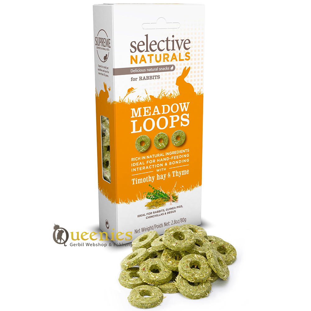 Naast het dagelijkse hooi en de voederkorrels mag je konijn of cavia ook weleens verwend worden met een lekker tussendoortje. Selective Naturals Meadow Loops van Supreme zijn een voedzame traktatie voor konijnen en cavia’s. De snacks bevatten veel vezels en geen toegevoegde suikers. De snoepjes zijn geschikt voor konijnen en cavia’s, maar kunnen ook gegeven worden aan je chinchilla of degoe en natuurlijk Gerbils.