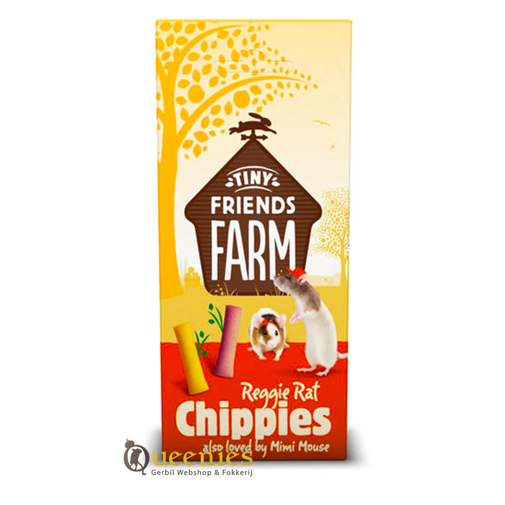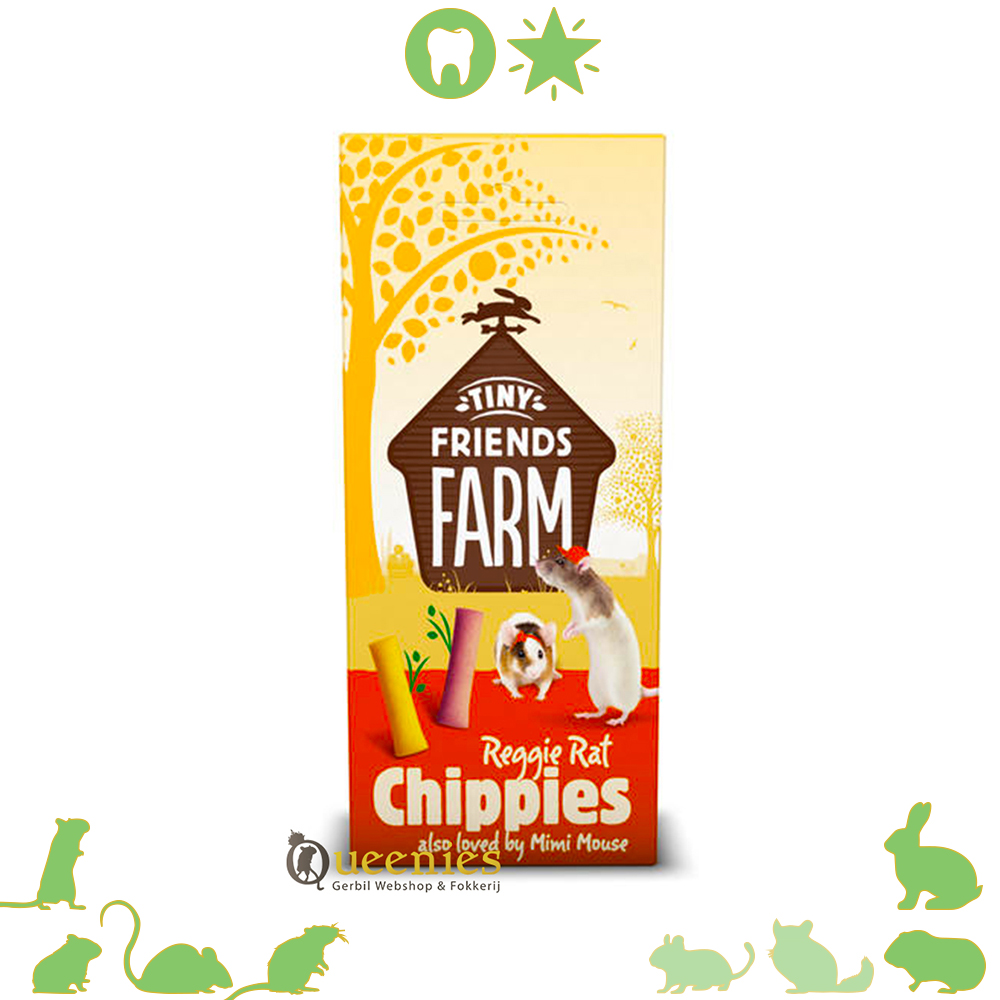 De Supreme Reggie Rat Chippies is een natuurlijke snack voor je Rat, Gerbil, Muis of Hamster. Naast de dagelijkse voederkorrels mag uw Rat of Muis ook weleens verwend worden met een lekker tussendoortje. Tiny Friends Farm Reggie Rat & Mimi Mouse Chippies zijn een voedzame traktatie voor ieder Knaagdier of Konijn. De koekjes zijn ook geschikt voor konijnen, chinchilla’s, cavia’s, gerbils en hamsters.