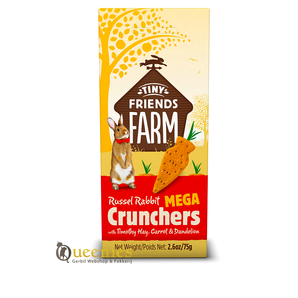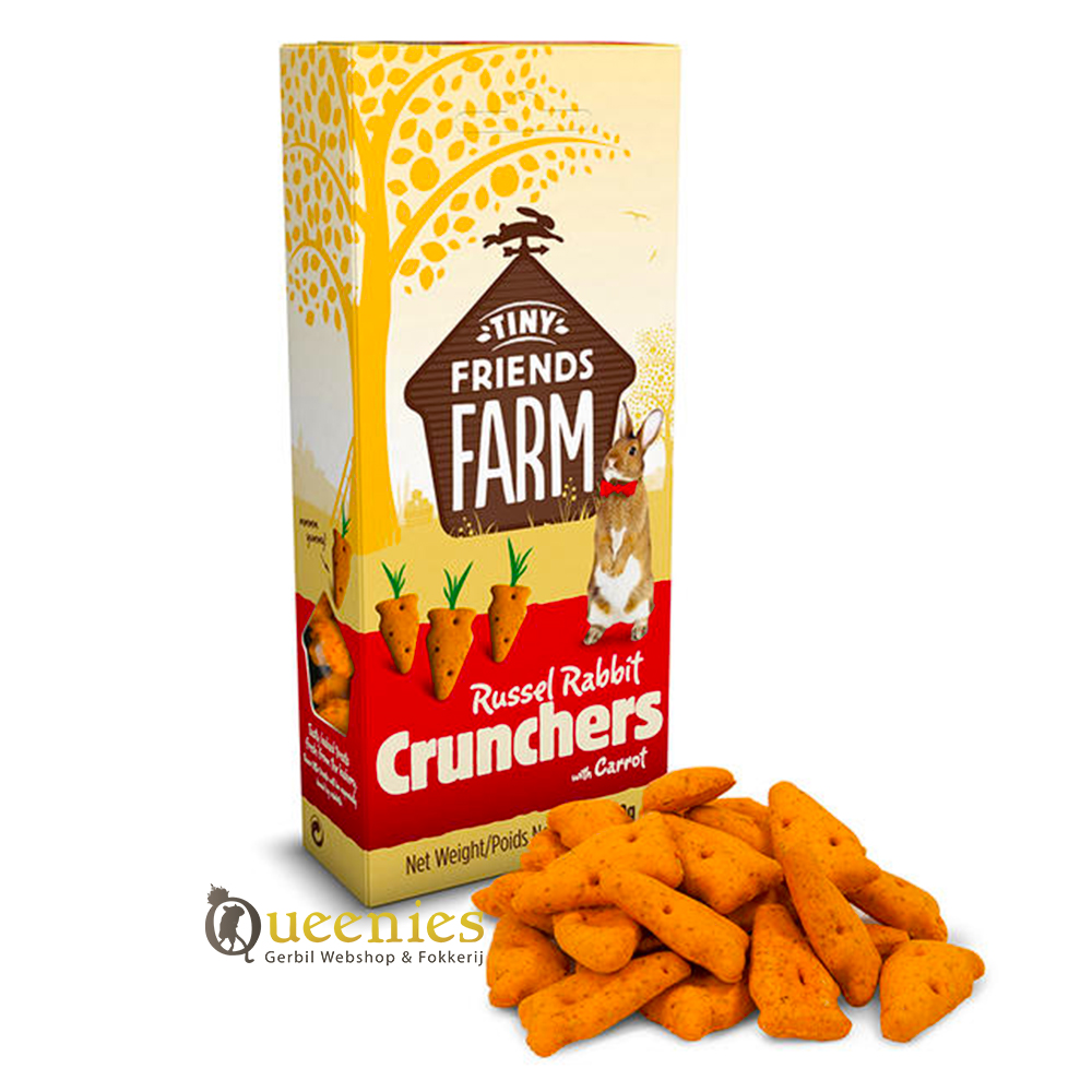 De Supreme Russel Rabbit  zijn krokante wortelkoekjes van Tiny Friends. Deze Crunchers met Carrot taste zijn geschikt voor Knaagdieren en Konijnen. Deze krokante wortelkoekjes zijn van een mooie grote zodat zowel Konijnen als Knaagdieren 1 koek per keer mogen snoepen. Een echte verwennerij voor onze lieve Knagertjes. Knapperig en vezelrijk in een leuke wortel look gebakken. Rechtstreeks uit de Engelse bakkerij voor onze kleine vriendjes ( Tiny Friends )