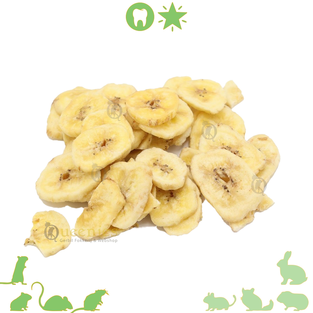 Deze krokante Bananen Chipsvoor Knaagdieren zijn natuurlijke lekkernij voor onze kleine snoeperds. Deze gezonde schijfjes van Banaan zijn bij veel Gerbils een ideale beloningssnack om de Gerbils  tam te maken. De schijfjes zijn soms gebroken en soms hele schijven, daar heeft Queenies niet veel invloed op, wanneer de schijven heel zijn zal u ze zelf moeten breken, wanneer de schijven al gebroken zijn kunt u ze mooi per gebroken stukje aanbieden aan uw knaagdier.