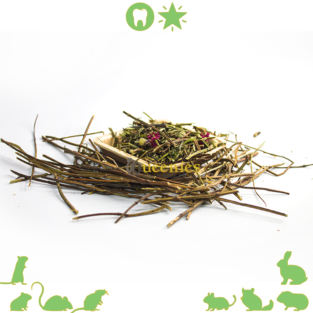Tandverzorging: Knagen en knabbelen, een direct voordeel daarvan is dat het de tandverzorging op een natuurlijke manier ondersteunt! Het kauwen op Citroenmelisse Steeltjes helpt daar dan ook bij. De takjes zijn knapperig, het geluid en het gevoel door het knabbelen hieraan geeft een geluksgevoel voor Knaagdieren, met name Knaagdieren zoals Gerbils, Degoes en Chinchilla’s. Het knabbelen helpt bij het afslijten van de tanden, dit voorkomt op die manier tandproblemen bij huisdieren.