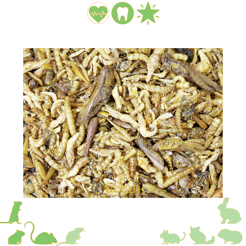 De Gedroogde insecten Mix van GerbilShopQueenies zijn een gezonde en lekkere snack of traktatie voor Gerbils en andere kleine knaagdieren die graag insecten lusten.