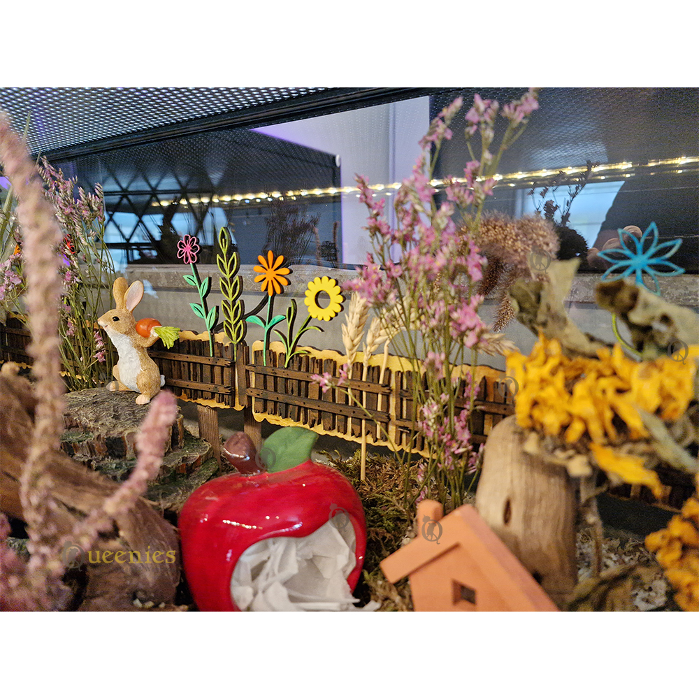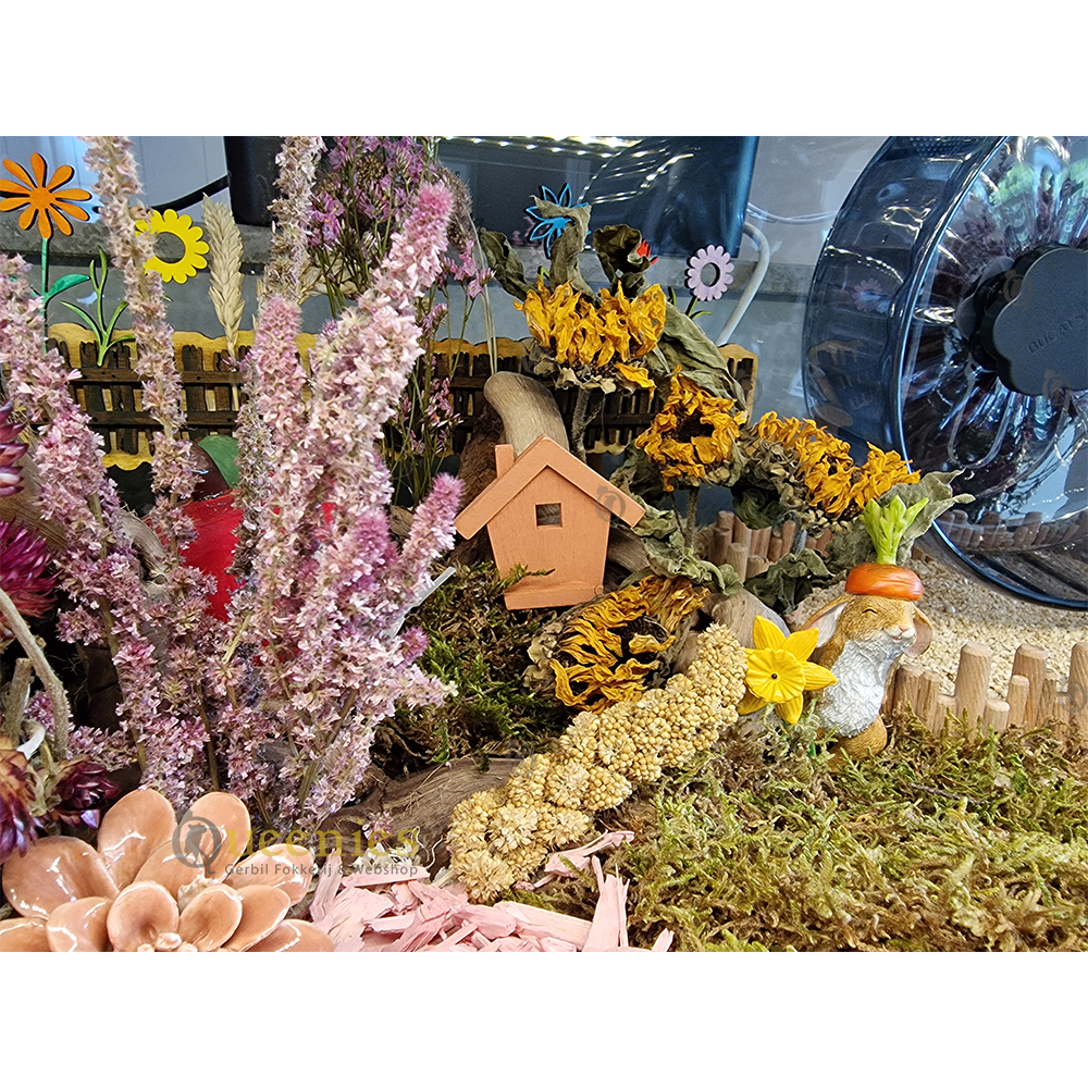 We noemde het hierboven al even, deze Zonnebloem is zeker geschikt in een Hamsterscape! Woorden komen eigenlijk te kort om aan te geven hoe weldig het staat in een hamsterscape. De felle goud gele bladeren geven echt kleur en variatie in een Terrarium / Gerbilarium. Combineer deze Gedroogde zonnebloem met Gedroogde Appelbladeren, Dennenappels, Mos en houten huisjes. Dit kleuren pallet zorgt direct voor een super natuurlijk ogende inrichting waardoor het geschikt is voor Hamsterscaping.