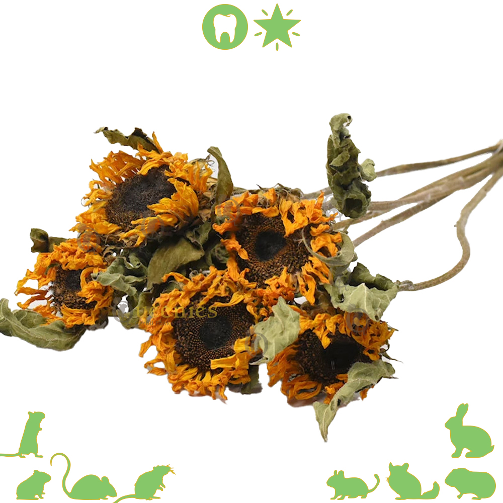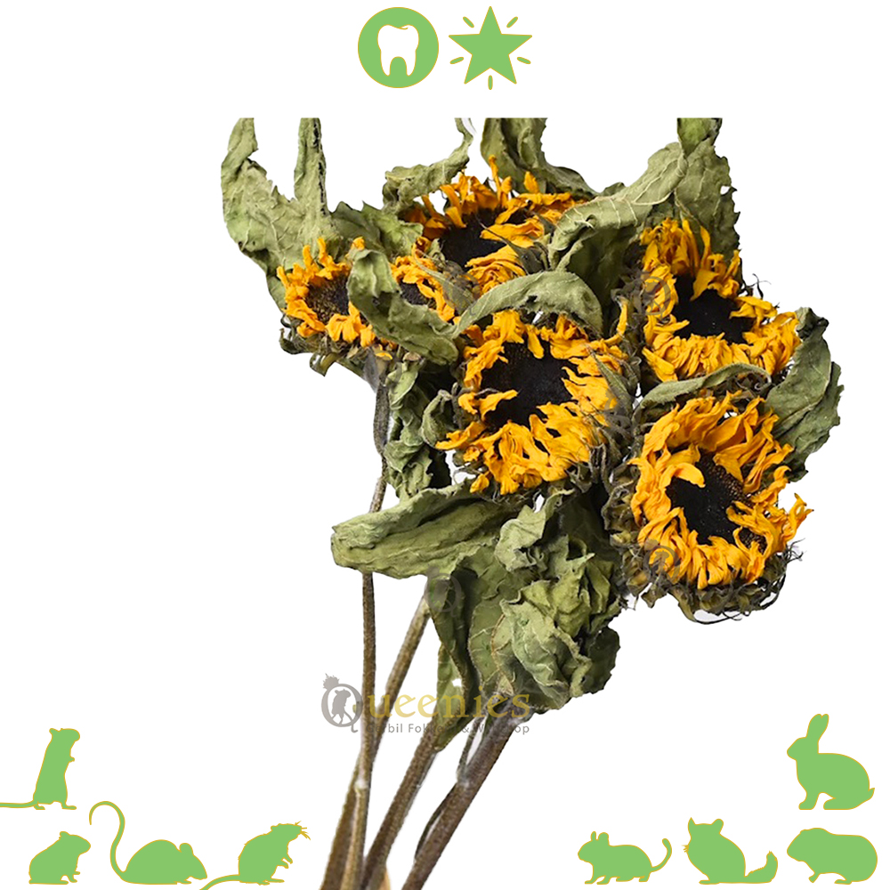 Wij raken niet uitgekeken op deze prachtige Gedroogde Zonnebloem! Staat werkelijk schitterend in ieder Knaagdieren terrarium! Het staat niet alleen prachtig, de Gerbils, of andere kleine knaagdieren hebben hier ook direct een flink lekkere snack aan! Niet alleen aan de zonnebloemen die in de bloem zitten doen het goed bij alle knaagdieren, maar ook juist de zonnebloemblaadjes zullen de Gerbils of Hamsters naar hartelust op smikkelen! Omdat deze Zonnebloem Mini is zult u geen pitjes terugzien in deze Zonnebloemen. Deze gedroogde Zonnebloem met stengel en bladeren is ter decoratie of voor de Zonnebloemblaadjes die een positief effect heeft op de gezondheid van uw huisdier. Deze gedroogde Zonnebloem heeft dus eigenlijk 3 functies. Knagen en knabbelen, Geneeskrachtige eigenschappen ( Zonnebloem blaadjes ) en het is een verrijking voor in een Hamsterscape.