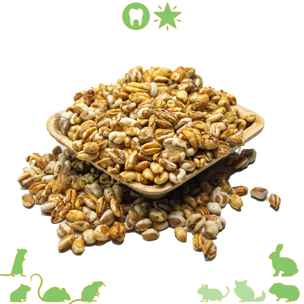 Deze Gepofte granen is net als Popvorn voor Knaagdieren en Konijnen. De gepofte granen bevatten een mix van gepofte tarwe, gepofte gerst en gepofte mais, in het laaste teval is het dus letterlijk popcorn. Deze vetarme mix van gepofte granen is een echte lievelingstussendoortje voor Knaagdieren. Het kan uit de hand gevoerd worden zodat er direct een contact moment is tussen u en uw huisdier.