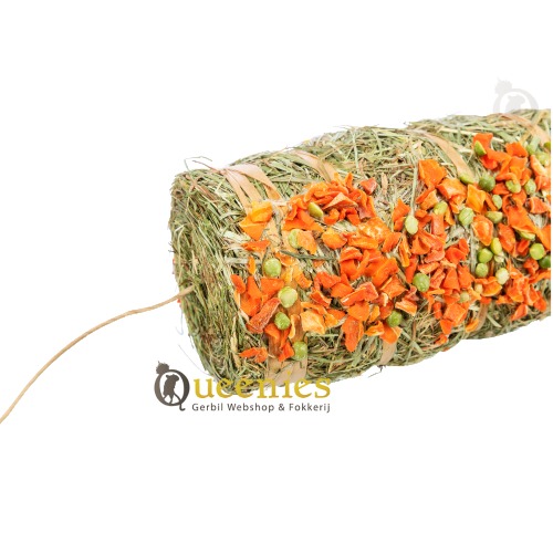 Deze overheelijke nieuwe Hooipendel van Trixie heeft de smaken Wortel en Erwten gekregen waarop ieder Knaagdier en Konijn dol is! Wortel en Erwten is een veel gebruikt ingredient bij Knaagdieren en Konijnen. Om de simpele reden dat ieder Knaagdier en of Konijn deze deze ingredienten erg kunnen waarderen! Deze hooipendel is iets zwaarder dan de andere hooi rollen die we al verkochten en al langer in het assortiment van Trixie was opgenomen. Deze hooirol of Hooipendel weegt namelijk 250 gram en als extra toevoeging kunt u deze ophangen in uw Knaagdierkooi omdat er al een touwtje doorheen is geregen door Trixie. Dat touw zit in het hart van de hooipendel verweven en is dus erg stevig. Uiteraard is het niet bestand tegen de tandjes van Gerbils en Konijnen. Wanneer u niet wilt dat uw huisdier de hooipendel koort doormidden knaagt kunt u het knaagproef maken met een ijzerdraadje.