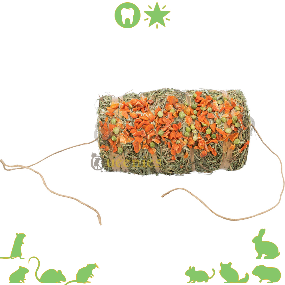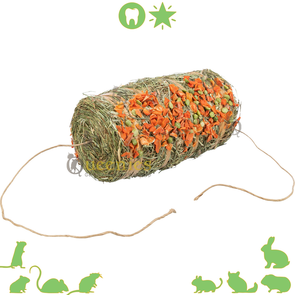 De Trixie Hooirol met Erwten en Wortel is handig om op te hangen, deze rol van wortel en erwt is een heerlijke, natuurlijke snack voor Konijnen en Knaagdieren wat bestaat uit ruwvoer. Zonder toegevoegde suikers en helemaal graanvrij! Deze smakelijke en uitdagende Hooipendel is een gezonde snack voor ieder Knaagdier of Konijn die de tandslijtage op een natuurlijke manier ondersteunt en verveling tegengaat. Deze hooibaal bestaat uit heerlijk vers bergweidehooi met stukjes erwt en wortel. Uw huisdier kan naar hartenlust knagen en knabbelen aan deze lekkere gezonde baal hooi. Dit houdt verveling tegen en stimuleert het natuurlijk instinct van uw Knaagdier of Konijn. Ook draagt het bij aan een gezonde spijsvertering en ondersteunt het bij de correcte en natuulrijke tandslijtage.
