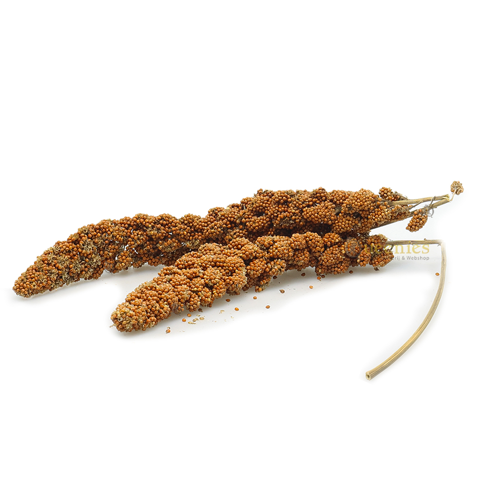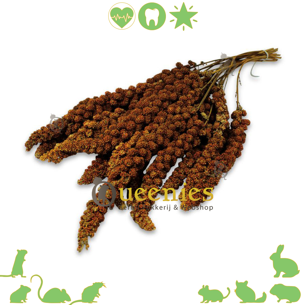 Door de stengels in de kooi te leggen zullen er zaatjes vallen. Dit stimuleert het natuurlijke eetgedrag van uw knaagdier. Dit noemen we foerageren. Het dier scharrelt rond opzoek naar eten. Voor Vogels is dit een kant en klaar maaltijd bomvol goede voedingstoffen. Bij Vogels mag dit product nooit ontbreken, bij Gerbils of knaagdieren is het meer een traktatie en een lekkere snack dan dat het echt noodzakelijk voor hen is. Trosgierst bevat een hoog gehalte Leucine. Leucine bevat veel aminozuren die weer onlosmakend met elkaar in verbinding staat als het gaat om eiwitten. Voor drachte knaagdieren is het dus raadzaam om haar te verwennen met een lekkere Trosgierst. Ze zal het niet alleen lekker vinden maar krijgt hierdoor ook de nodige eitwitten binnen die zo belangrijk zijn om de melkproduct op gang te brengen. Ook bevat het Rode trosgierst veel kiezelzuren wat de opbouw van de huid, de vacht en de nageltjes ondersteunt.