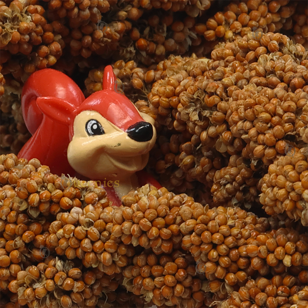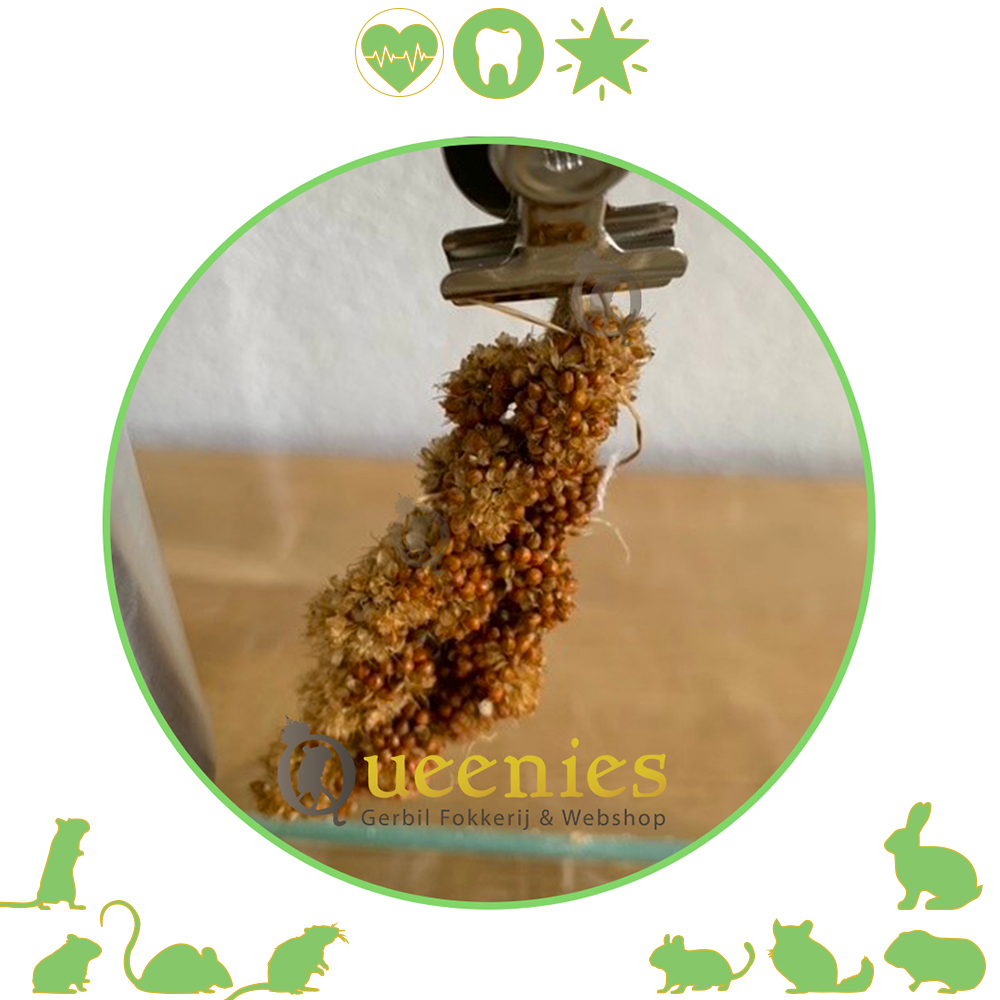 Rode Trosgierst blijft een eeuwige verwennerij voor Gerbils. Dit zal nooit in een Gerbil verblijf blijven liggen, maar altijd in grote dankbaarheid ontvangen en opgepeuzeld worden. Rode Franse Trosgierst in de beste kwaliteit trosgierst die gekozen kan worden. Afkomstig uit de streken rond de Middellandse zee. Dat betekent dat er veel Vitamine B1 en B6 in zitten vanwege de vele zonuren die er zijn in die streek. Trosgierst bevat veel, heel veel positieve eigenschappen. Zo heeft het een laag vetgehalte, maar zit het ook vol vezels en eiwitten, naast de vitamine B die eerder is genoemd. Trosgierst is een gedroogde grassoort en kan dienen als traktatie maar ook als verrijking aan uw knaagdieren kooi. De trosgierst geeft een mooie natuurlijke uitstraling aan uw hamsterscape. Steek nooit een hele bos rode trosgierst in het zaagsel bij hamsters. Een Hamster gaat hier van blijven eten / hamsteren wat zijn gezondheid niet ten goede komt. Wanneer u dit als verrijking in het knaagdierenkooi toevoegt, zorg er dan wel voor dat er niet onbeperkt van gegeten kan worden.