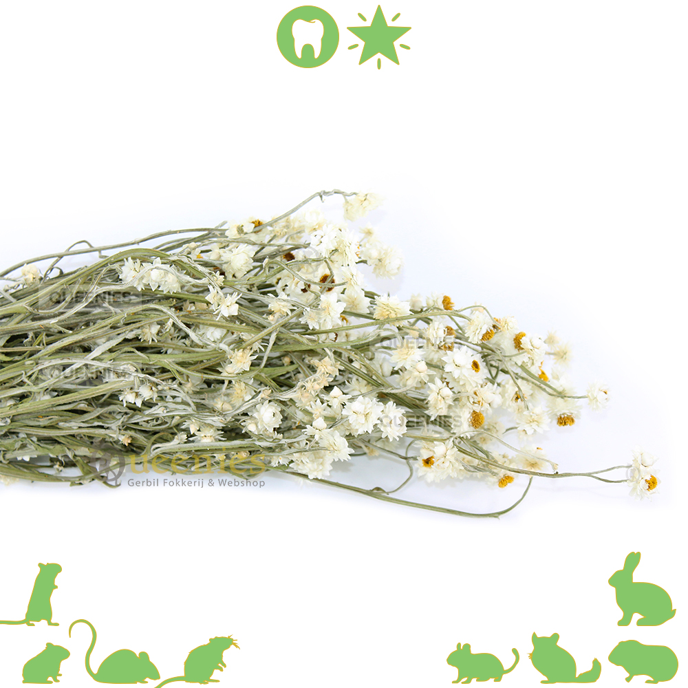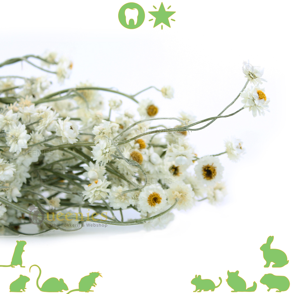 Nou en of Degoes en Chinchilla's deze gedroogde Kamille bloemen ook kunnen waarderen! Juist Degoes en Chinchilla's houden erg van deze gedroogde bloemsoort. Dat komt omdat de voeding van deze 2 diersoorten puur gericht is op gedroogde grasssoorten. Zij zijn diabetes gevoelige dieren en eten om die reden erg licht verteerbare voeding. Maar niet alleen Degoes of Chinchilla's houden hiervan hoor. Het is echt geschikt voor alle Knaagdieren en Konijnen. Dus ook alle hamster soorten, muizen, ratten en natuurlijk onze Gerbils! Niet alleen deze Kamille valt in de smaak van al deze dieren, maar alle gedroogde grassoorten en gedroogde boemen is een traktatie voor deze dieren.