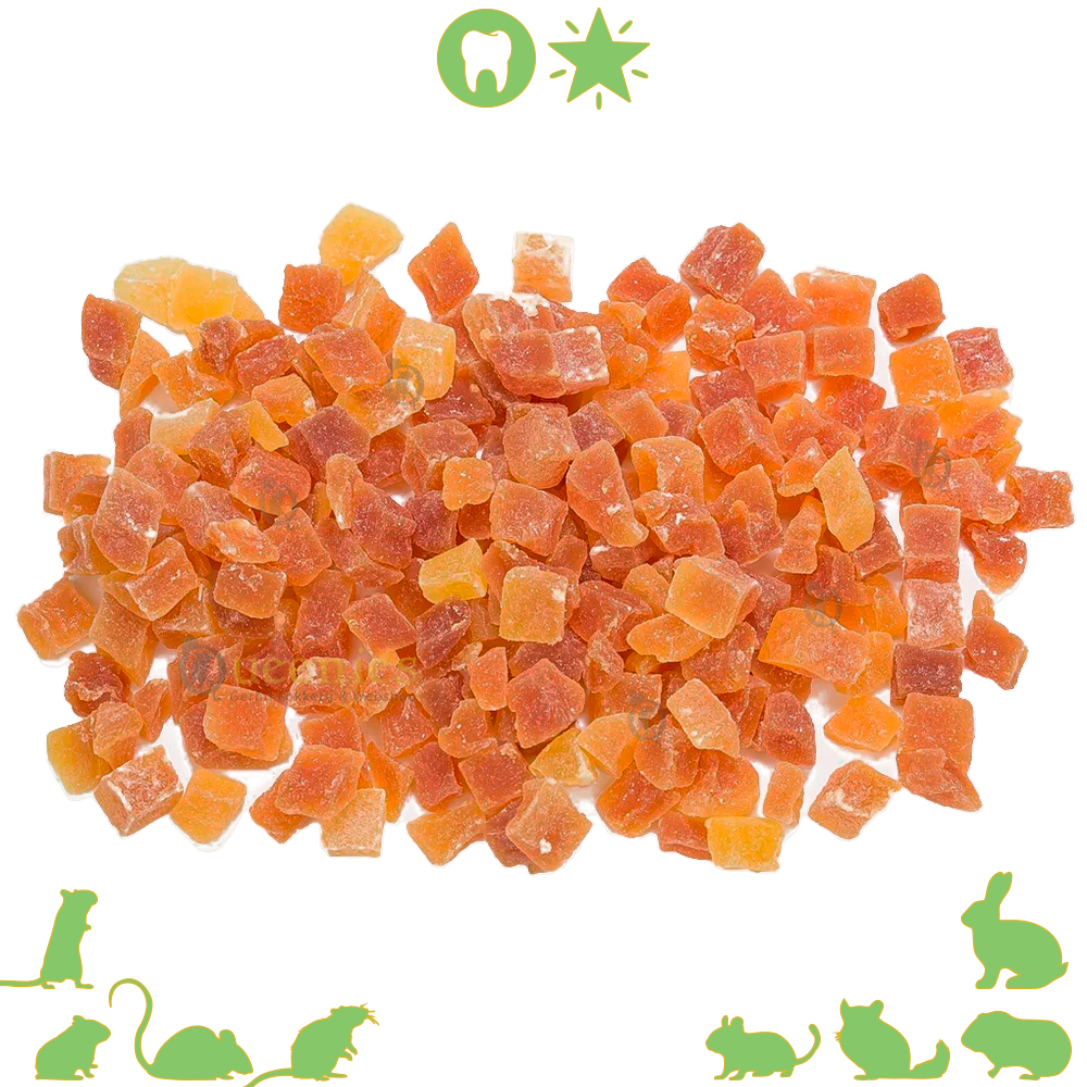 Doordat de Papaya rijk is aan voedingstoffen zoals Vezels en Vitamines is deze Gedroogde Papaya blokjes ook erg Voedzaam. Een voedzaam ideet bij Goudhamsters, Gerbils of Muizen zorgt voor een goede basis. Naast dat de Gedroogde Papaya voedzaam is, is het ook erg smakelijk voor Kleine Knaagdieren zoals een Muis, Rat of Chinchilla. Doordat de Papaya niet veel voorkomt in Knaagdieren voer of Snacks heeft het een unieke Textuur voor Knaagdieren die ermee in aanraking komen. Een unieke smaakbeleving die een enorme variatie in het dieet brengt bij Konijnen of andere Knaagdieren zoals onze geliefde Gerbils.