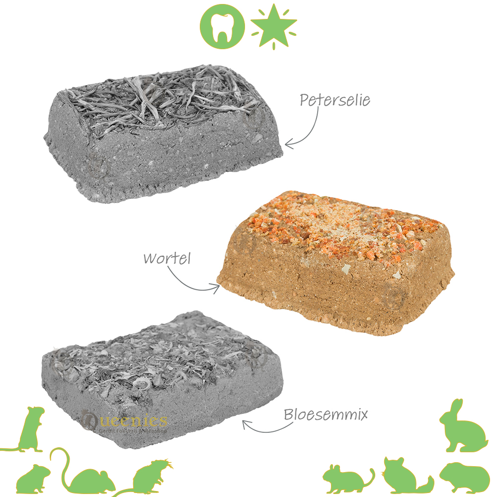Knaagsteen op basis van kleisteen met bloesemmix, wortel of Peterselie. Deze 3 populaire smaken dragen bij aan de gezondheid en het natuurlijke knaaggedrag van uw Knaagdier, zowel Gerbils, als hamsters tot grotere Knaagdieren als Cavia of Konijnen.