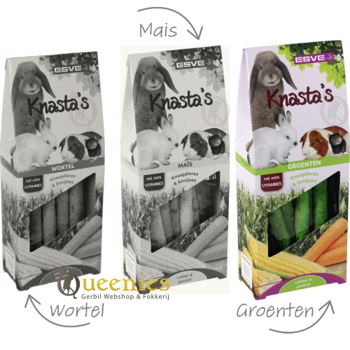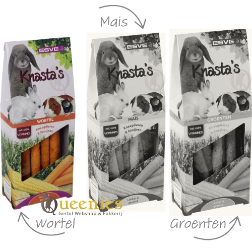 Knaagdier Knas-ta's Dé beloning voor elke dag. KNAS-TA’s zijn heerlijke en gezonde tussendoortjes met belangrijke voedingsstoffen, welke uw knaagdier verwennen. Bevordert tevens de spijsvertering en knaagbehoefte. Aanvullend diervoeder voor hobby konijnen en knaagdieren.