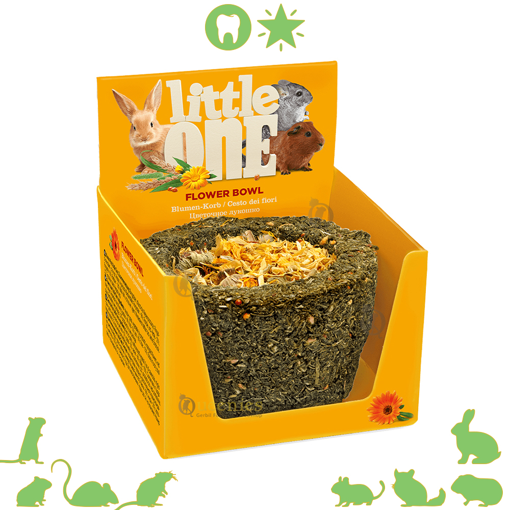 Bloemenschaal wordt gemaakt van Weidegras en Goudsbloemen welke op speciale wijze gedroogd zijn zodat essentiele en nuttige carotenoïden maximaal behouden zijn gebleven. Het bakje is hard genoeg om dienst te doen bij de verzorging van het gebit van Knaagdieren en Konijnen. UIteraard ook uitermate geschikt voor het knaaggedrag van een gerbil. Een gezonde snack die ook zorg draagt voor een gezond gebit.