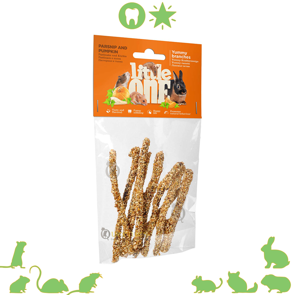 Yummy knaaghout met Pastinaak en Pompoen is niet alleen een heerlijk tussendoortje voor knaagdieren en konijnen, ze zijn ook een gezonde aanvulling op hun dieet. De traktatie is een waardevolle bron van vitaminen en mineralen uit takken en fruit. Deze knaaghout sticks, samen met de andere varianten, Kiwi en Appel, Bloemblaatjes en grassen, zijn een echte hit bij gerbils en andere knaagdieren. Eerder gehoord geluid is dat de Chinchilla's van Meno ze aanvallen