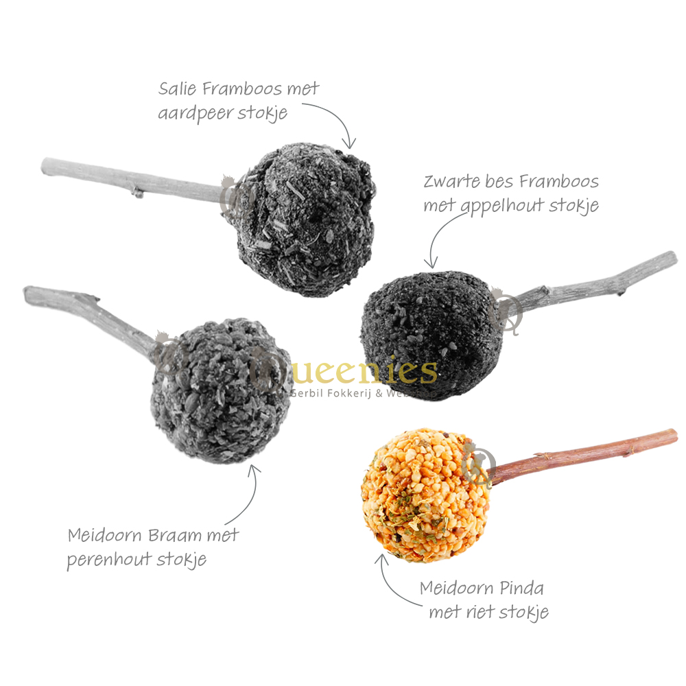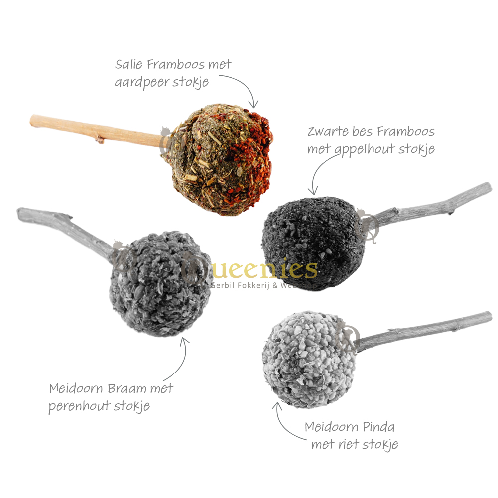 Er zijn maar liefst 4 verschillende soorten en smaken beschikbaar van de Lolly. Salie en Framboos smaak zit op een aardpeer stokje. Aardpeer wordt ook wel Topinamboer genoemd, deze verrassende combinatie hebben wij in 10 jaar tijd nog niet eerder voorbij zien komen. Onze Gerbils lusten er wel pap van!