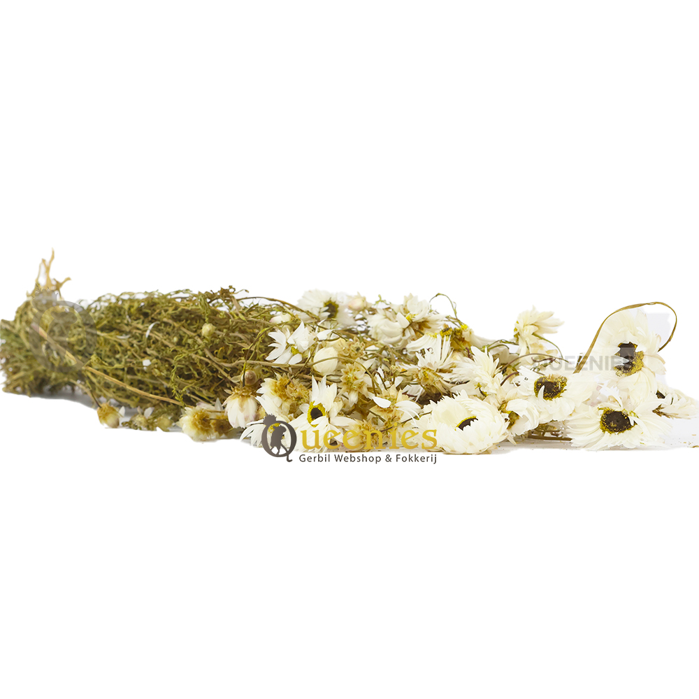 De Papierbloem 150 gram is een spierwitte bloemenbos geschikt in Hamsterscaping voor Knaagdieren zoals Dwerghamsters of Goudhamsters. Maar ook voor Gerbils is de Papierbloem erg geschikt. De Papierbloem is een witte bloemenzee die veel variatie brengt in een Gerbil Terrarium of Hamsterkooi. Doordat de Papierbloem zo wit is lijkt het net licht te geven wat een hele mooie of zelfs een magische uitstraling geeft aan het Terrarium van het Knaagdier of Konijn. De lange stengels van de Papierbloem zijn niet alleen visueel mooi om naar te kijken. Het is ook zo ontworpen dat het veilig is voor Knaagdieren en Konijnen.