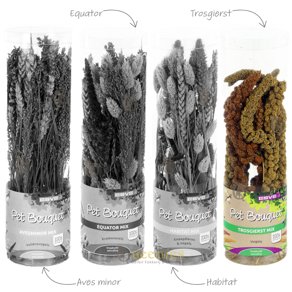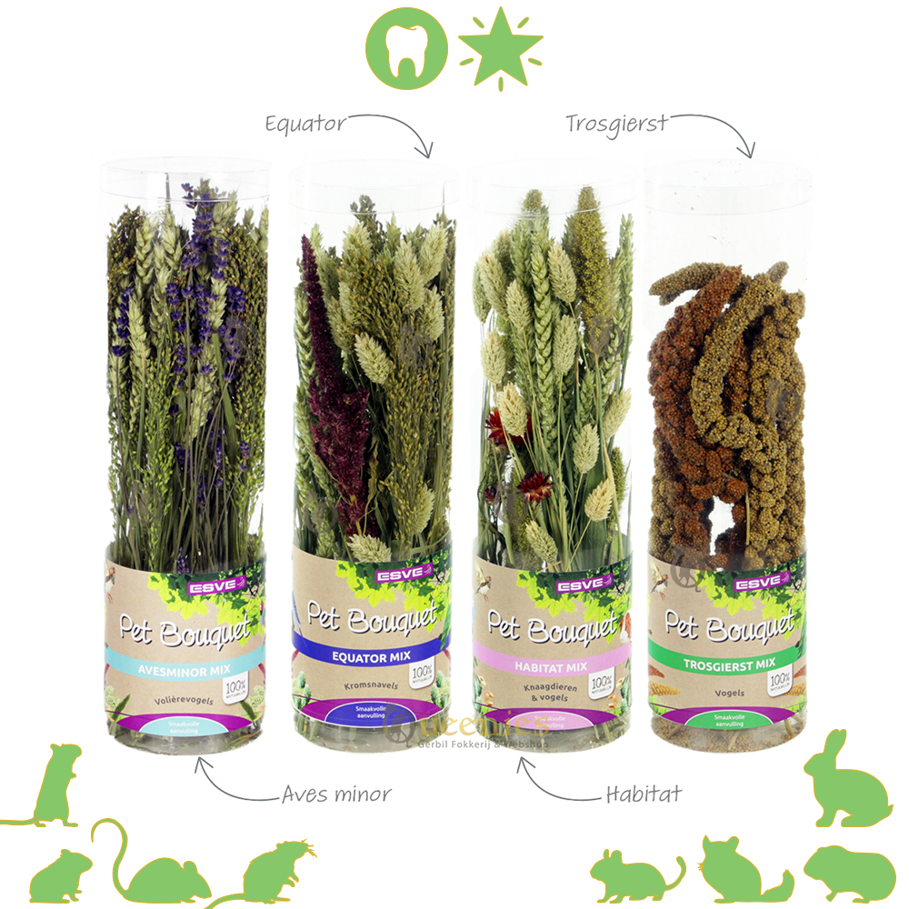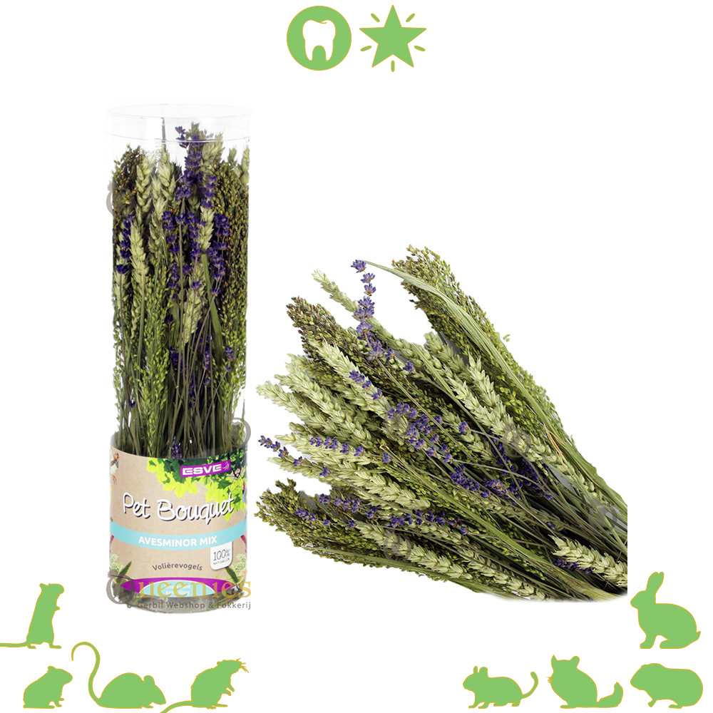1) Pet Bouquet Aves Minor is een smakkelijke mix van granen, grassen en bloemen zoals Tarwe, Haver, Amarant en Heermoes