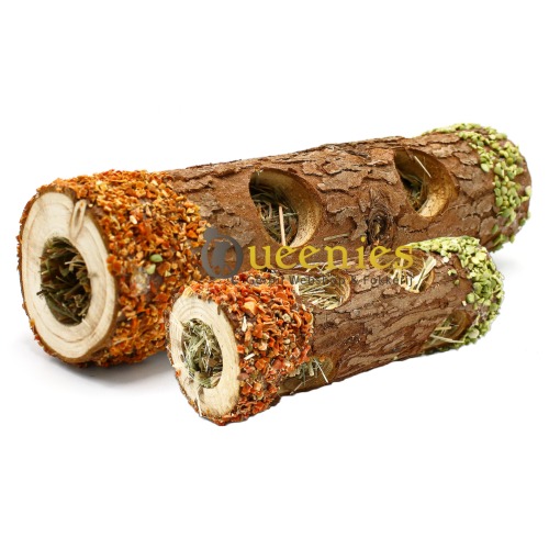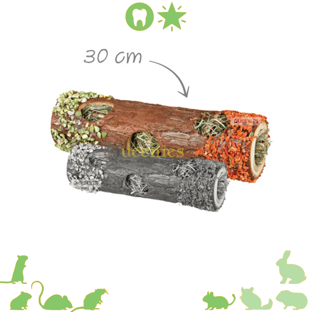 Dat maakt deze grote Snack Boomstam van 30 cm een speel en snackobject in 1 product! De holle grote boomstam is bedekt met gedroogde wortelen en erweten. Lekker knapperig en erg smakelijk. De binnenkant van deze speeltunnel is gevuld met heerlijk verse en vezelrijke hooi met hibiscusbloem.
