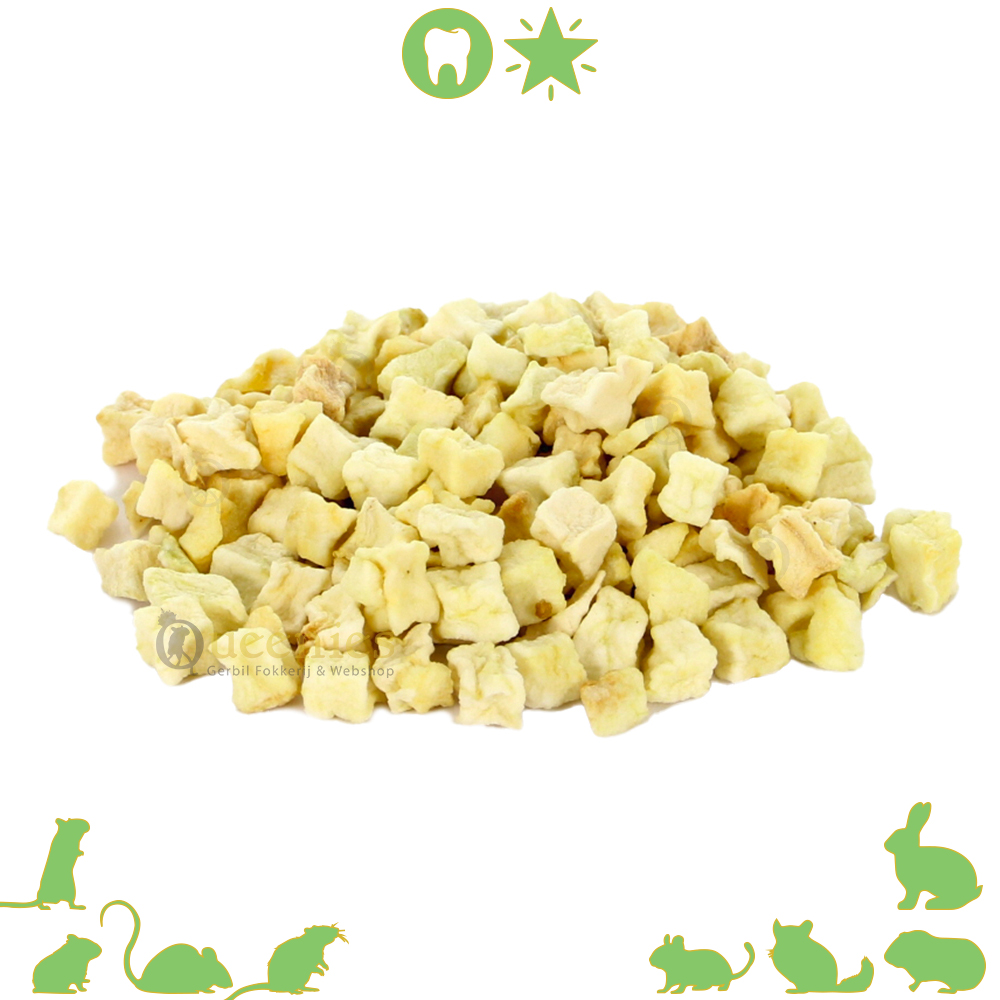 Inhoud: 100 gram fijn gesneden krokante appelblokjes Samenstelling:100% appel zonder kunstmatige conserveringen of toevoegingen. Geschikt voor: Knaagdieren en Konijnen zoals Gerbils, Hamsters, Dwerghamster, Goudhamster, Muisjes, Ratten, Degoes, Chinchilla, Konijnen