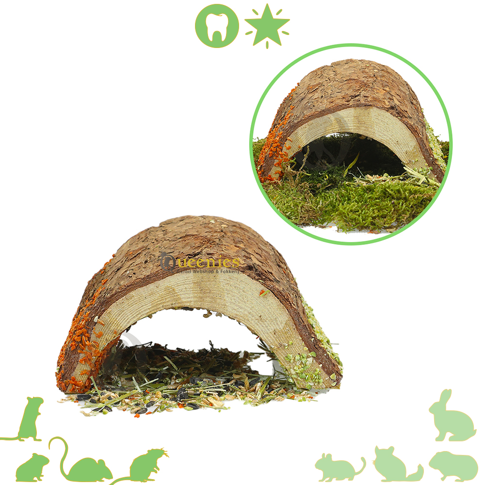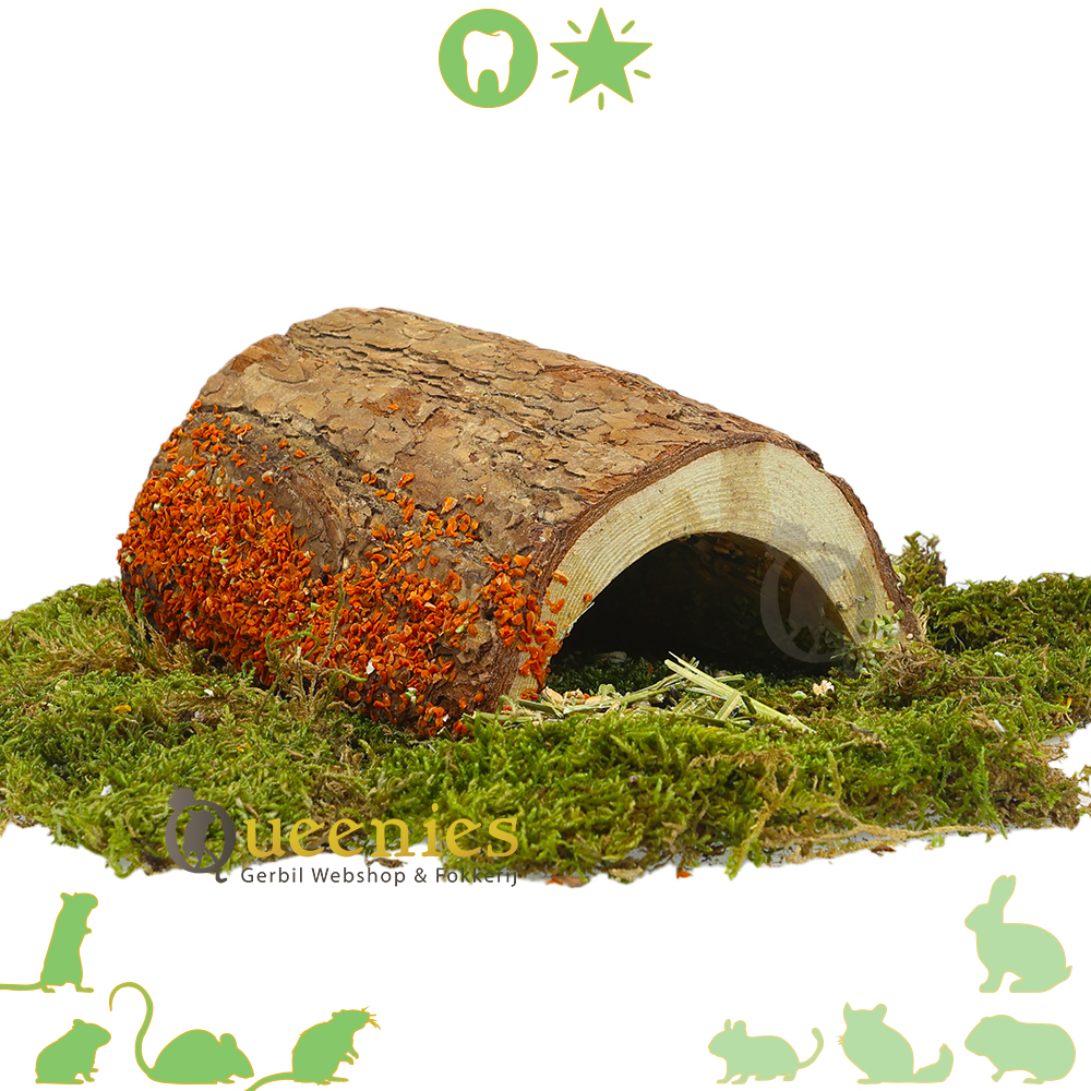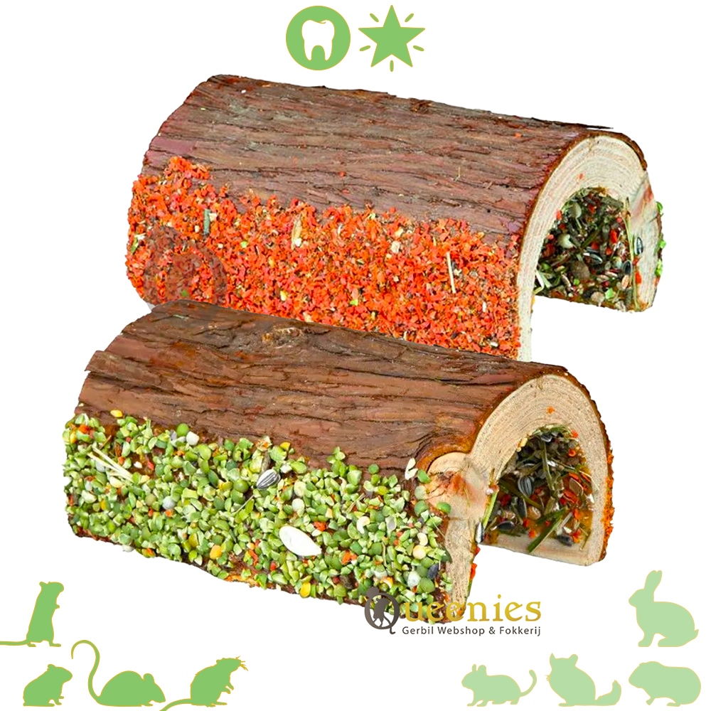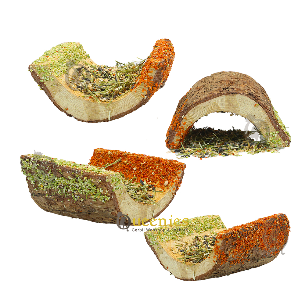 Overheerlijke Snack verwennerij in een halve boomstam tunnel zonder toegevoegde suikers en gemaakt van natuurlijk schorshout! De Brug is aan de binnenkant volledig met overheerlijke snacks bezaaid en vastgeplakt met natuurlijk honing substraat. De bovenzijde is gedeelte met lekkere snacks vast geplakt. Het is dus volledig veilig voor Gerbils en knaagdieren en ook nog een beetje gezond door de gedroogde wortelen die erop geplakt zitten. een ware verwennerij voor Gerbils en hamster vol met lekkers! Zowel in als op de tunnel bezaaid met noten en gedroogde groentes.