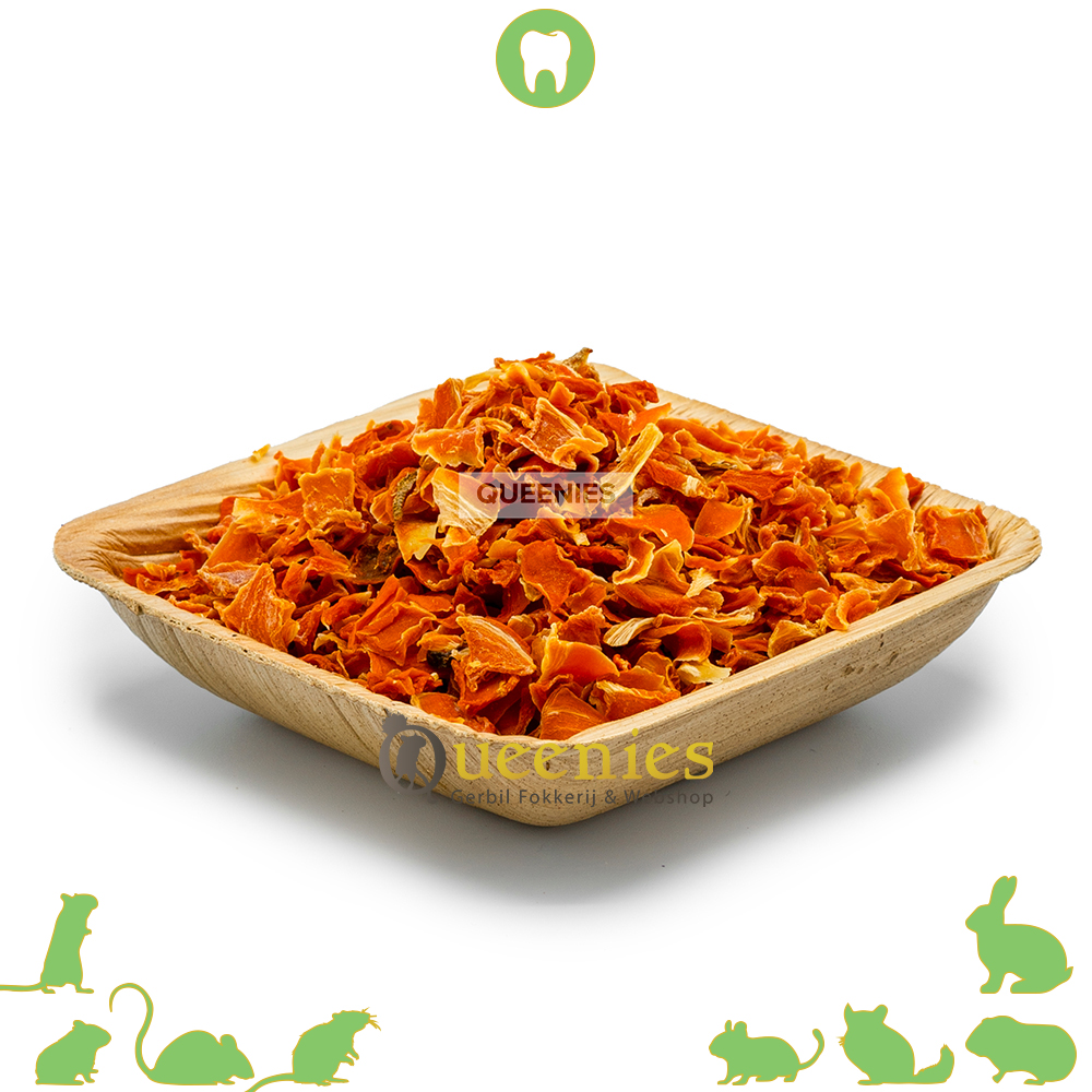 Geef kleine stukjes Wortel aan een Knaagdier. Dat maakt het eten gemakkelijker. Daarom zijn deze Wortelen gemaakt van allerlei kleine stukjes gedroogde Wortel. Wanneer er een beetje Gedroogde Wortel over de basisvoeding van jouw huisdier wordt gestrooid is dit voldoende. Het is erg belangrijk om Knaagdieren en Konijnen variatie te geven in hun voeding. Wortels zijn daarom een goede toevoeging. Hoewel Wortelen erg goed zijn voor Knaagdieren en of Konijn blijft het een traktatie en moet het met mate gegeven worden en niet als vervanging gebruikt worden voor hun dagelijkse menu.