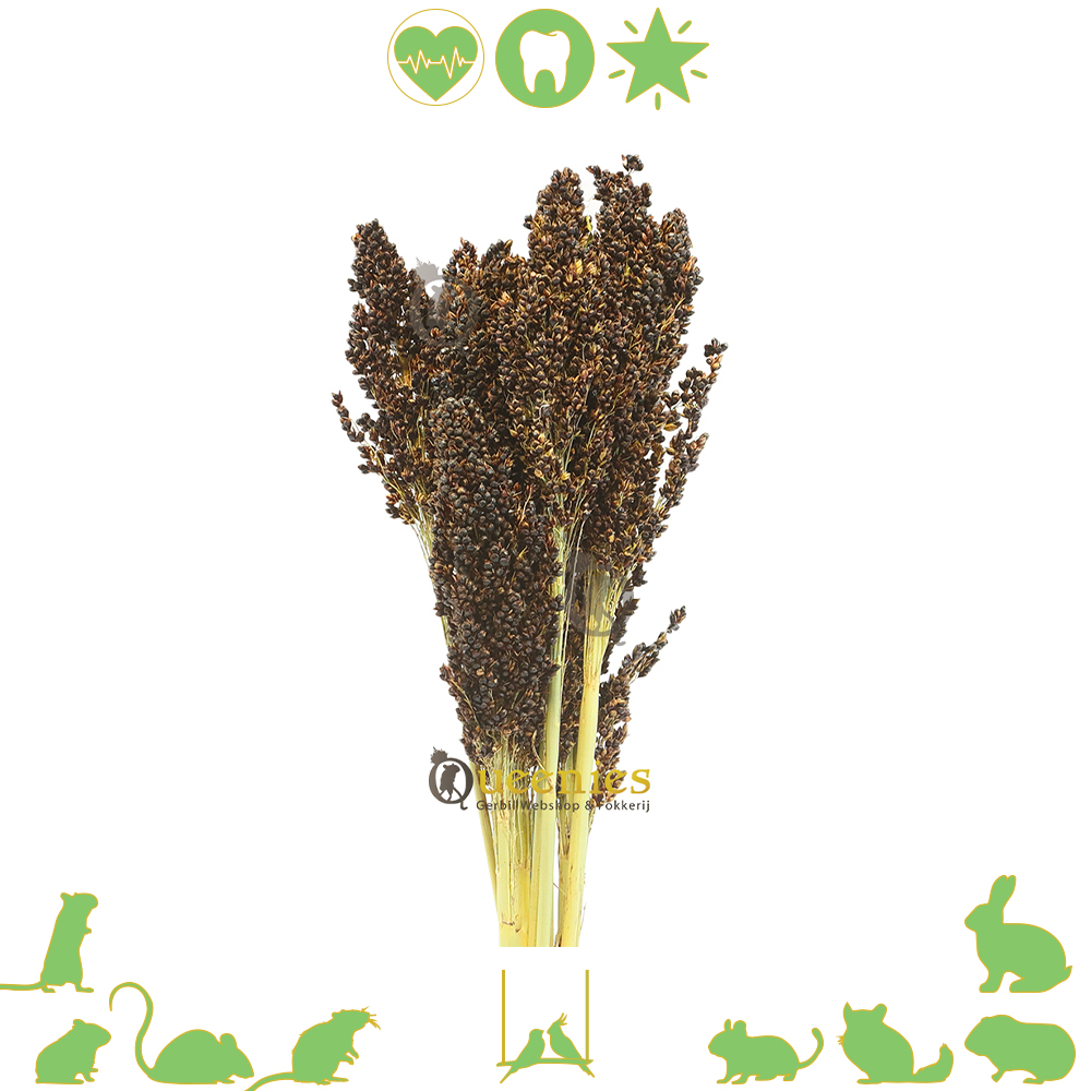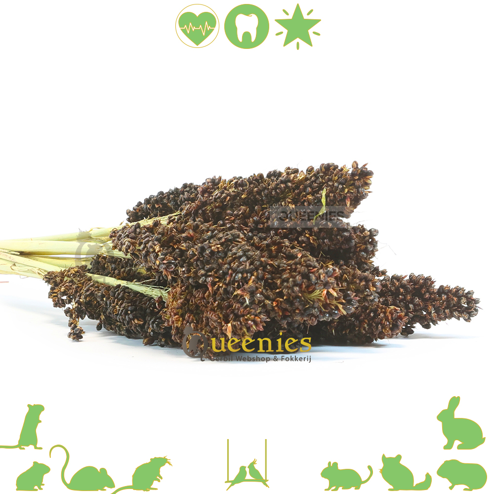 Een Dari Kolf heeft verschillende namen. Zo wordt deze zwarte variant ook wel Sorghum genoemd, maar staat het ook bekend als Gierst. Het is een bron van energie doordat deze Zwarte Dari Kolf voor 60 - 70% uit koolhydraten bestaat. De Zwarte Dari Kolf heeft een laag vetgehaald van slechts 5% en een redelijk hoog eiwitgehalte van rond de 12%. U kunt het vergelijken met een banaan voor mensen. Veel vezels met weinig vet wat voor een voldaan gevoel zorgt en waar u een goede energie boost van krijgt. Ook is Dari glutenvrij en bevat het veel mineralen en vitamines voor herbivoren knaagdieren.