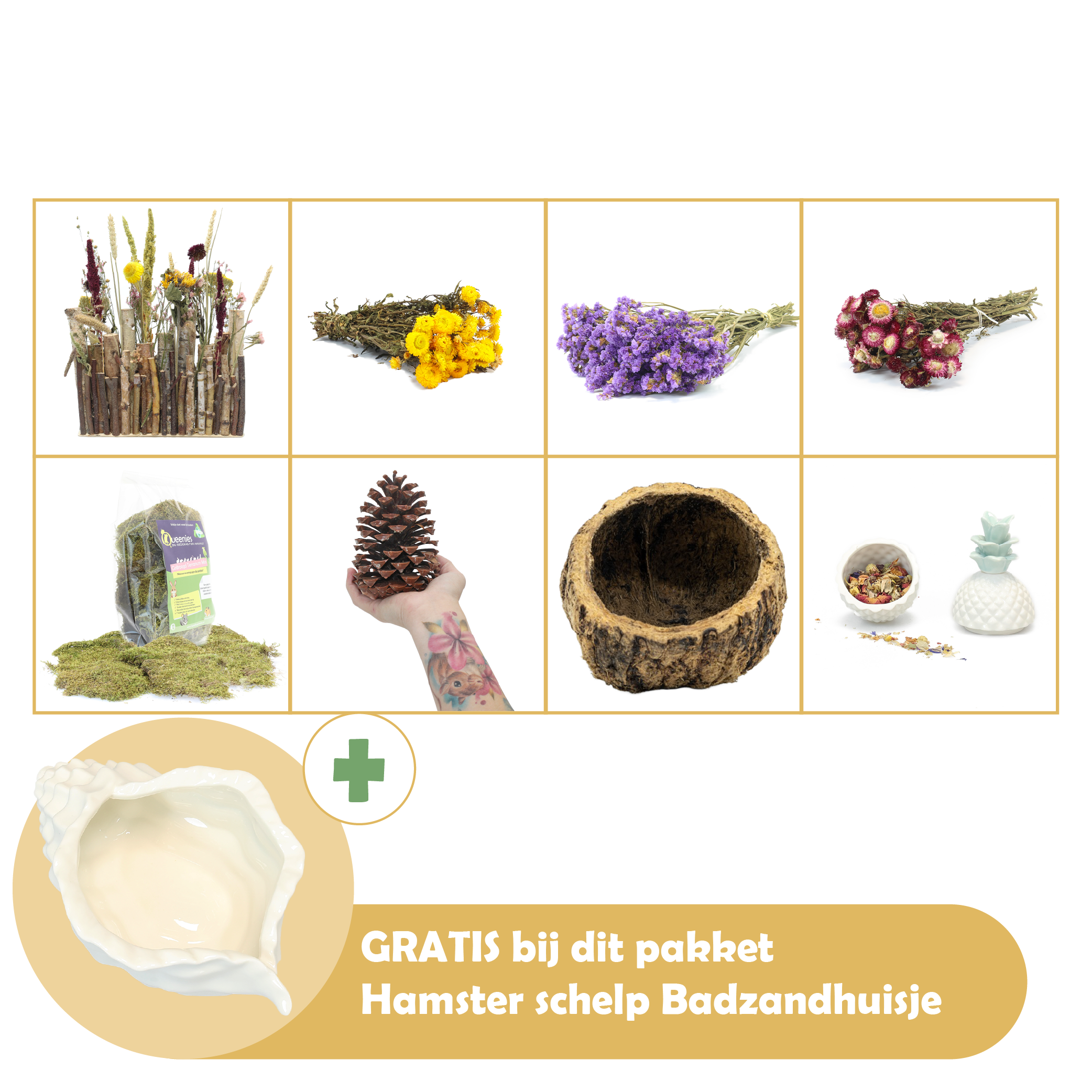 Dit pakket bevat een prachtige selectie natuurlijke materialen waarmee je het verblijf van je hamster of gerbil direct kleur, sfeer en speelsheid geeft. Met vrolijke bloemen, zacht mos en natuurlijke houten accessoires creëer je zonder moeite een warm en natuurlijk geheel.