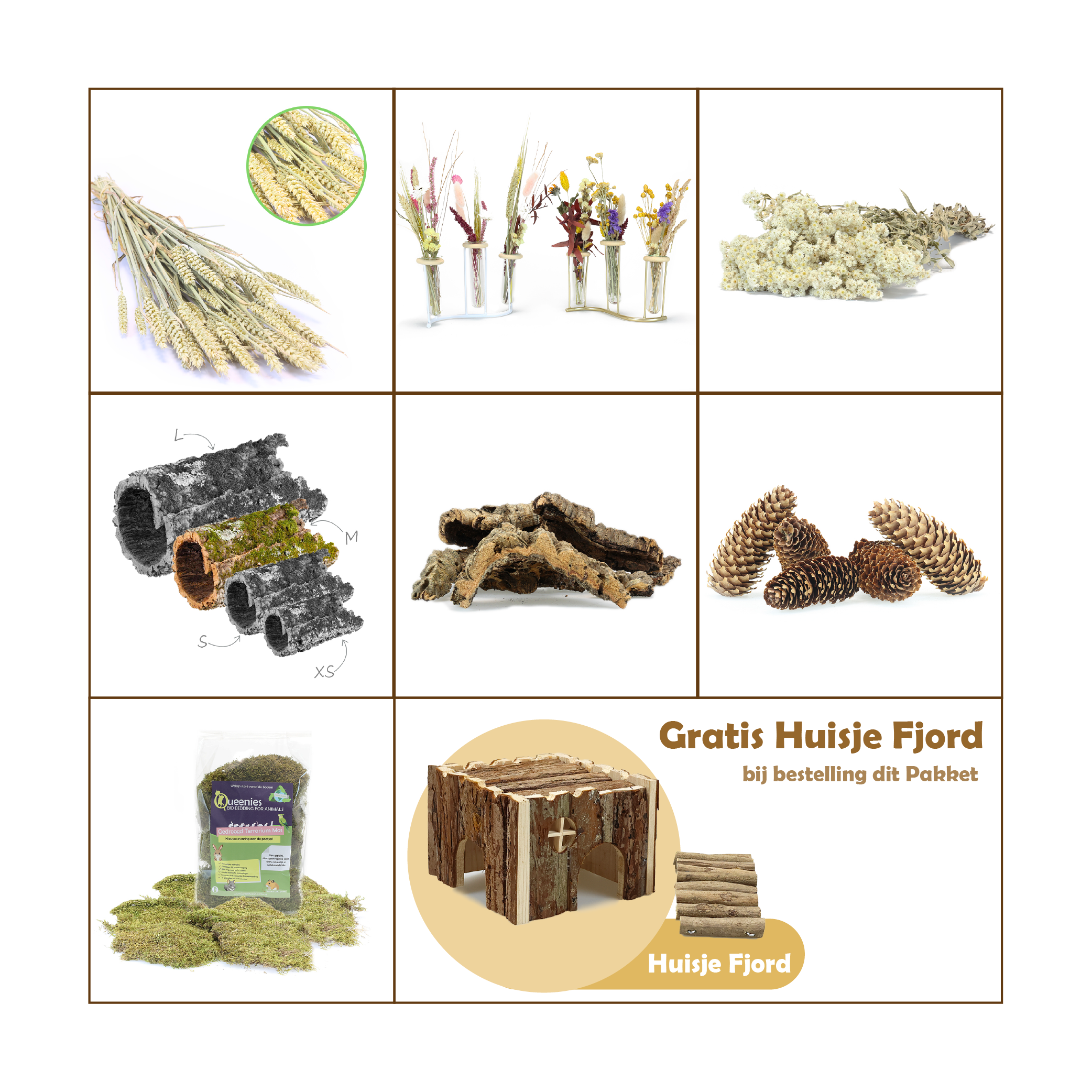 Het pakket bestaat uit zorgvuldig geselecteerde decoraties die een natuurlijke basis vormen voor het verblijf. Kurk geeft structuur, schuilplekjes en hoogte. De kurktunnel M fungeert als doorgang of rustplek. Dennenappels zijn ideaal voor decoratie en om tussen te zoeken. Het tarwebos voegt hoogte en een rustgevende uitstraling toe. Het gedroogde mos en Edelweiss zorgen voor zachte accenten en een lichte, frisse look.