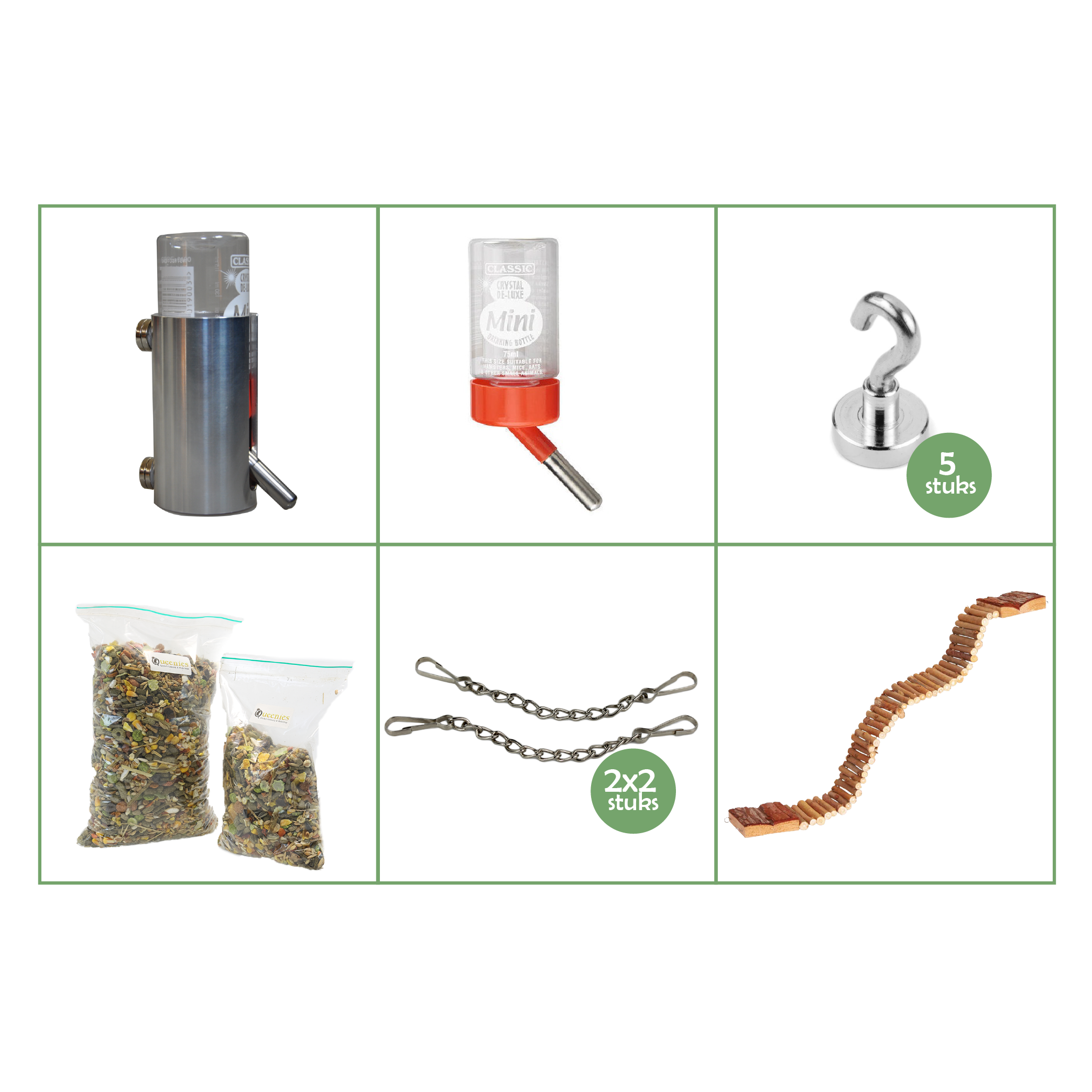 Met dit pakket heb je alles in huis om het verblijf van je dier overzichtelijk, praktisch en compleet te maken. Een ideale set die altijd van pas komt bij zowel nieuwe als bestaande verblijven.