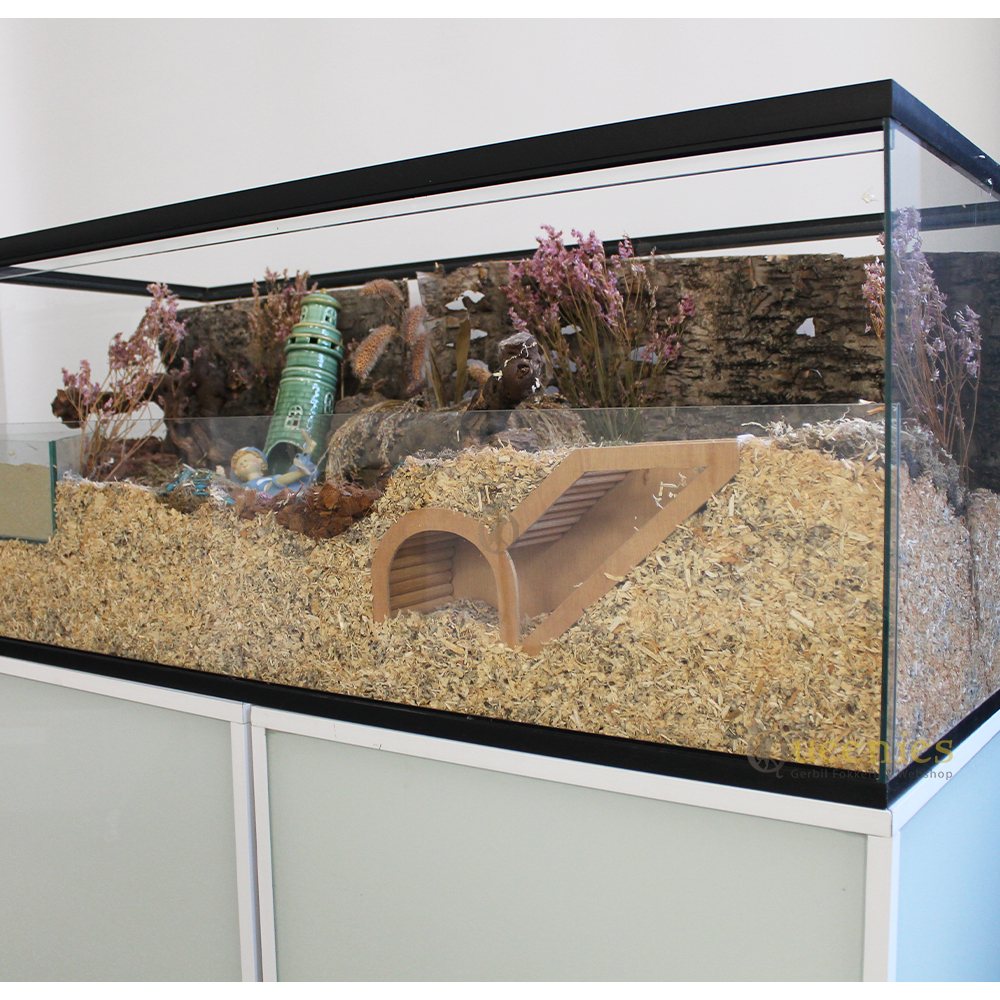 Het terrarium is volledig van glas en voorzien van schuifruiten aan de voorzijde. Dankzij het formaat is het geschikt voor zowel dwerghamsters als andere kleine knaagdieren. De aanwezige bodembedekking, schuilplekken en accessoires zorgen voor een natuurlijke en functionele inrichting waarin direct gehuisvest kan worden.