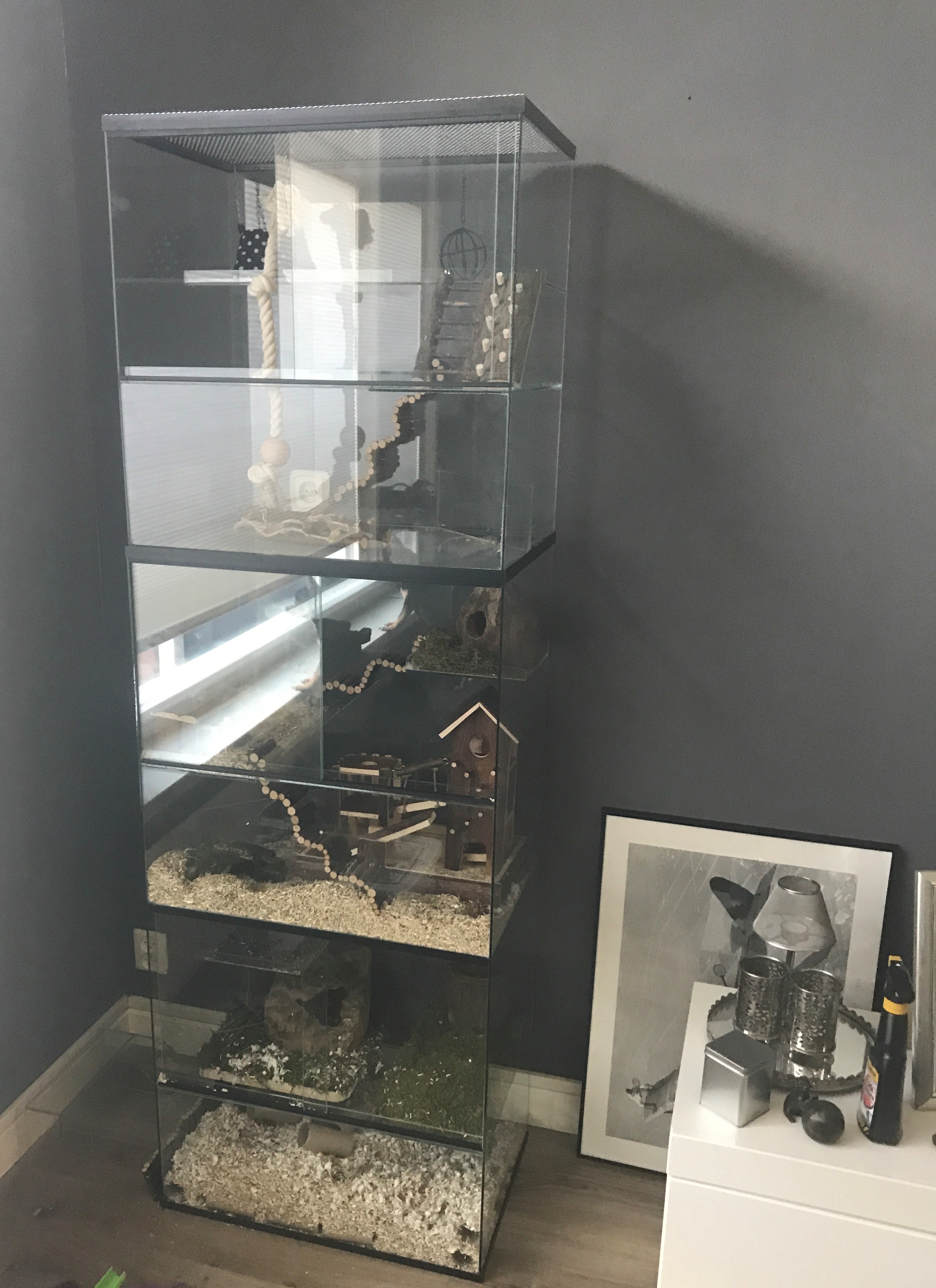 Een Gebruikte 60x40x120 + opzetstuk met schuifruiten en plateaus. De staat is gebruikt, her en der lichte schades ( geen glasbreuk ). Schuifruitjes hebben soms een kleine schade, maar verder is het hok in prima staat. Zeker voor de prijs waarvoor het wordt aangeboden. Nieuwprijs is € 448.95. De overige attributen op de foto zitten er niet bij.