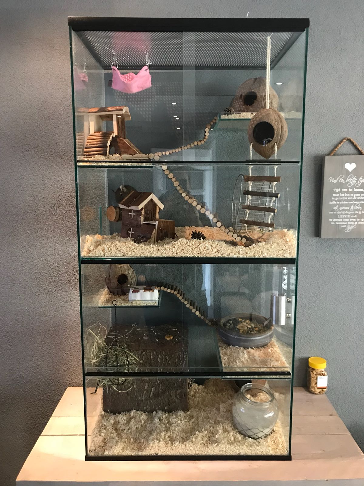 Voor een hamster vinden wij deze kooi minder geschikt, maar ook niet ongeschikt. Zeker als u het hok dan afsluit van boven en beneden kunt u hier 2 hamsters in huisvesten.