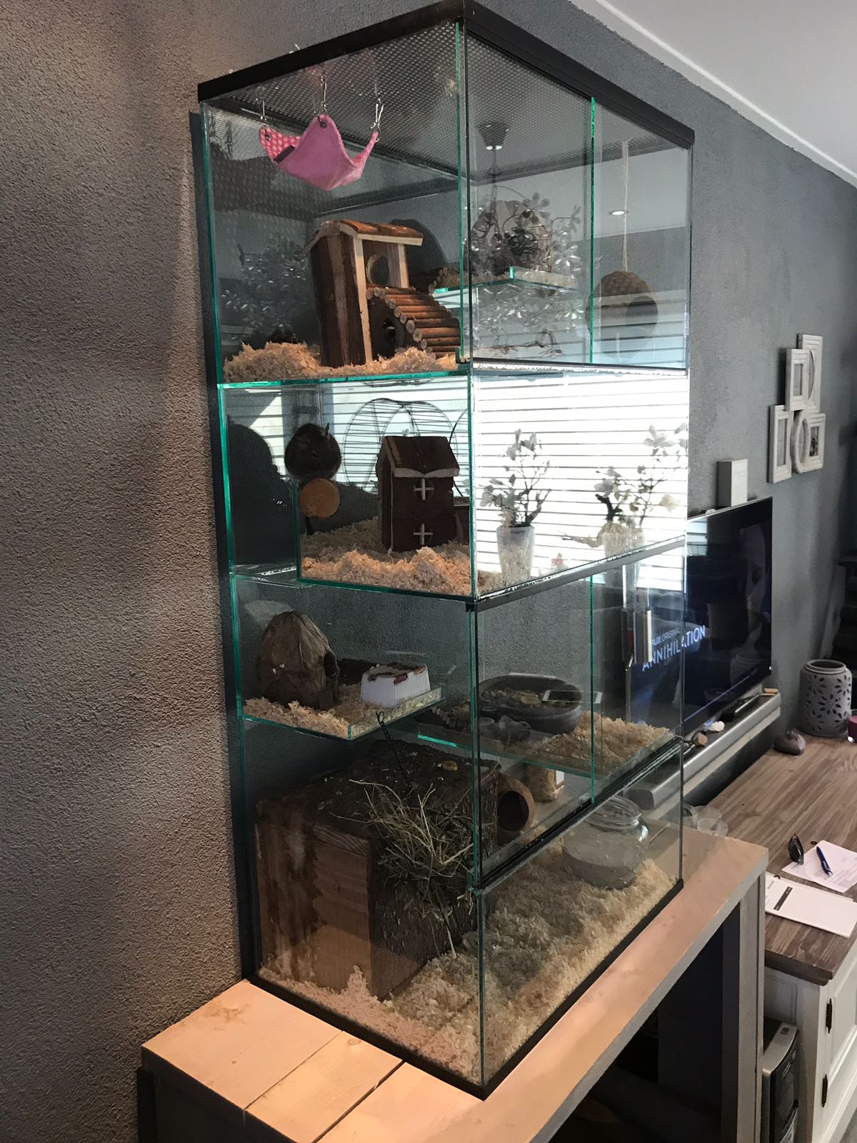 Dit knaagdieren terrarium voor degoes is 60x40x120, dat is de minimale afmeting voor het houden van 2 degoes.