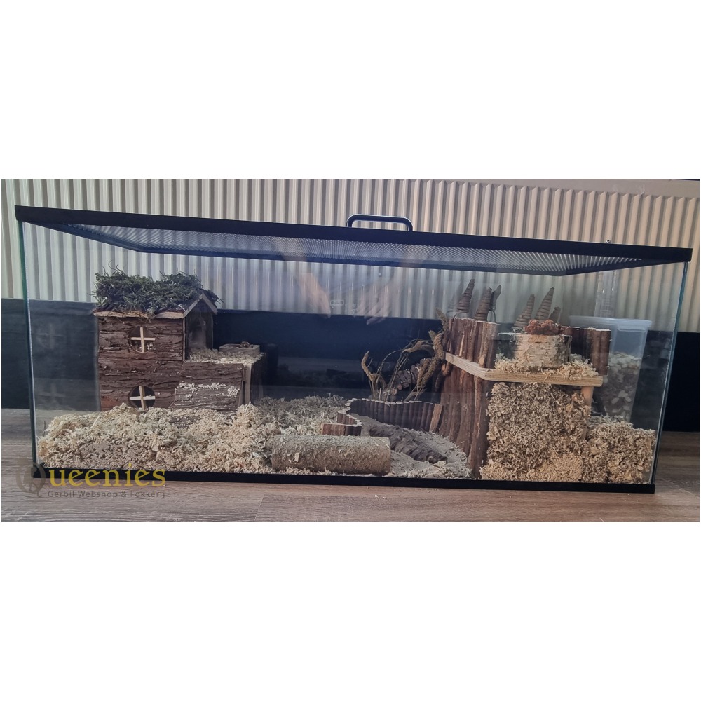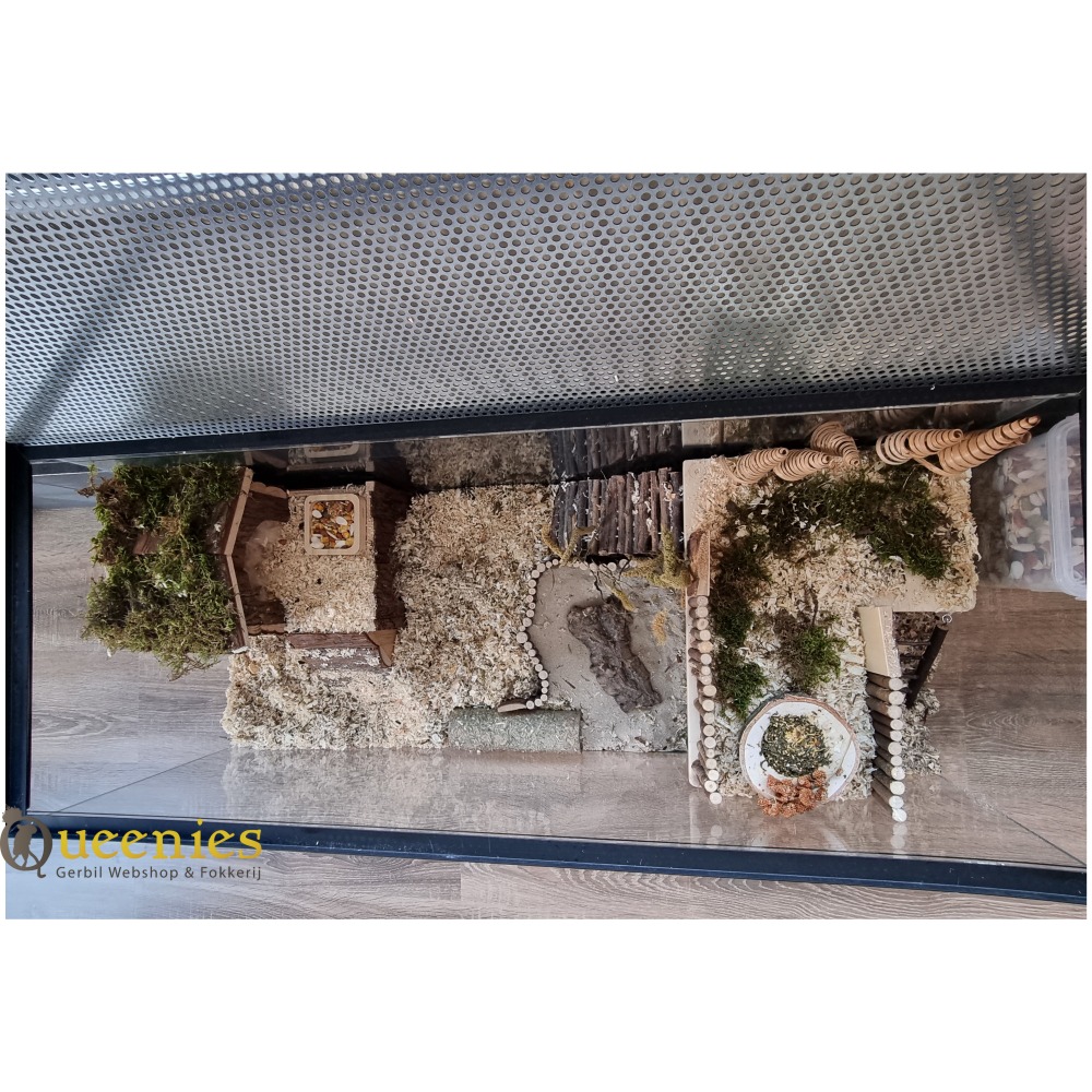 Glazen verblijven is altijd een pré bij ieder diersoort. Het staat netjes en opgeruimd in uw woonkamer. De Gerbils of andere knaagdieren kunnen niet ontsnappen en u heeft altijd goed zicht op wat uw geliefde huisdier aan het doen is.Strak en netjes afgewerkt zoals u dit van Queenies gewend bent. Een verrijking voor uw interieur.
