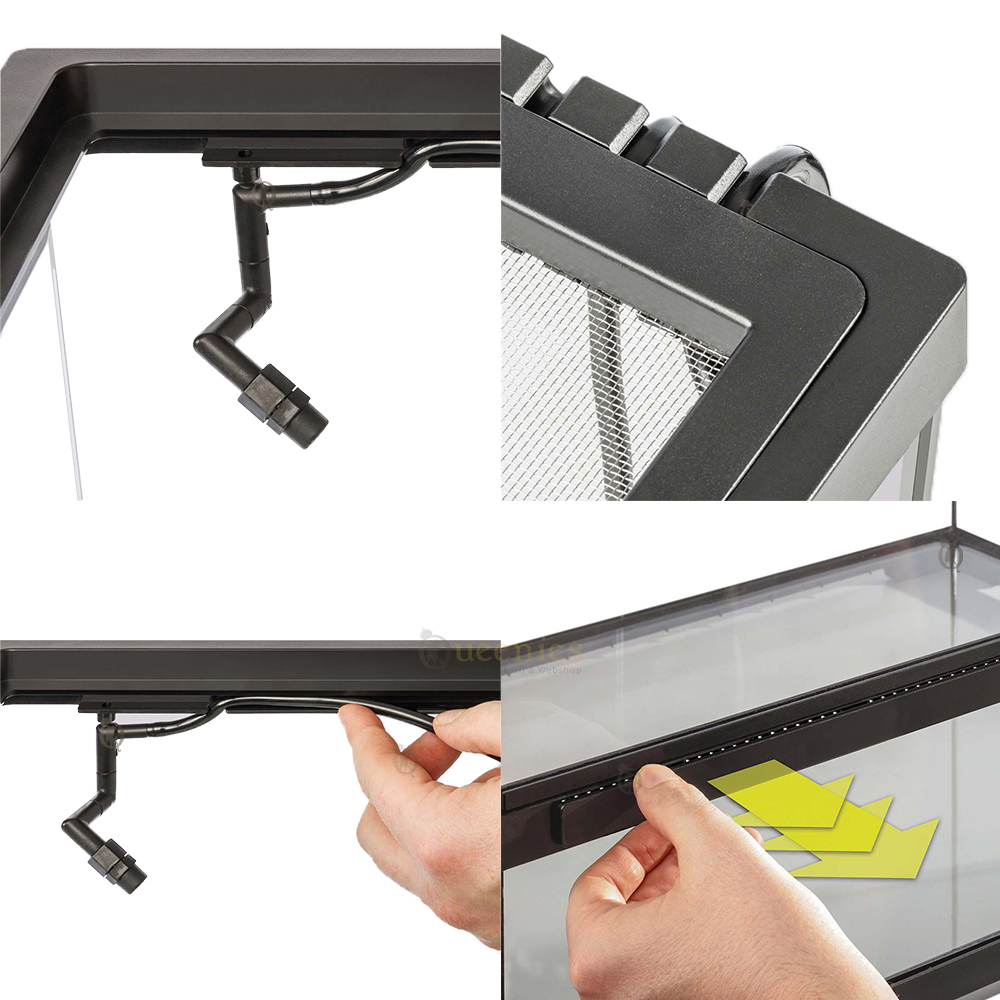 De bovenzijde is volledig afneembaar waardoor inrichten en schoonmaken eenvoudig is. Hierdoor kun je het terrarium steeds aanpassen aan de behoeften van je dieren.