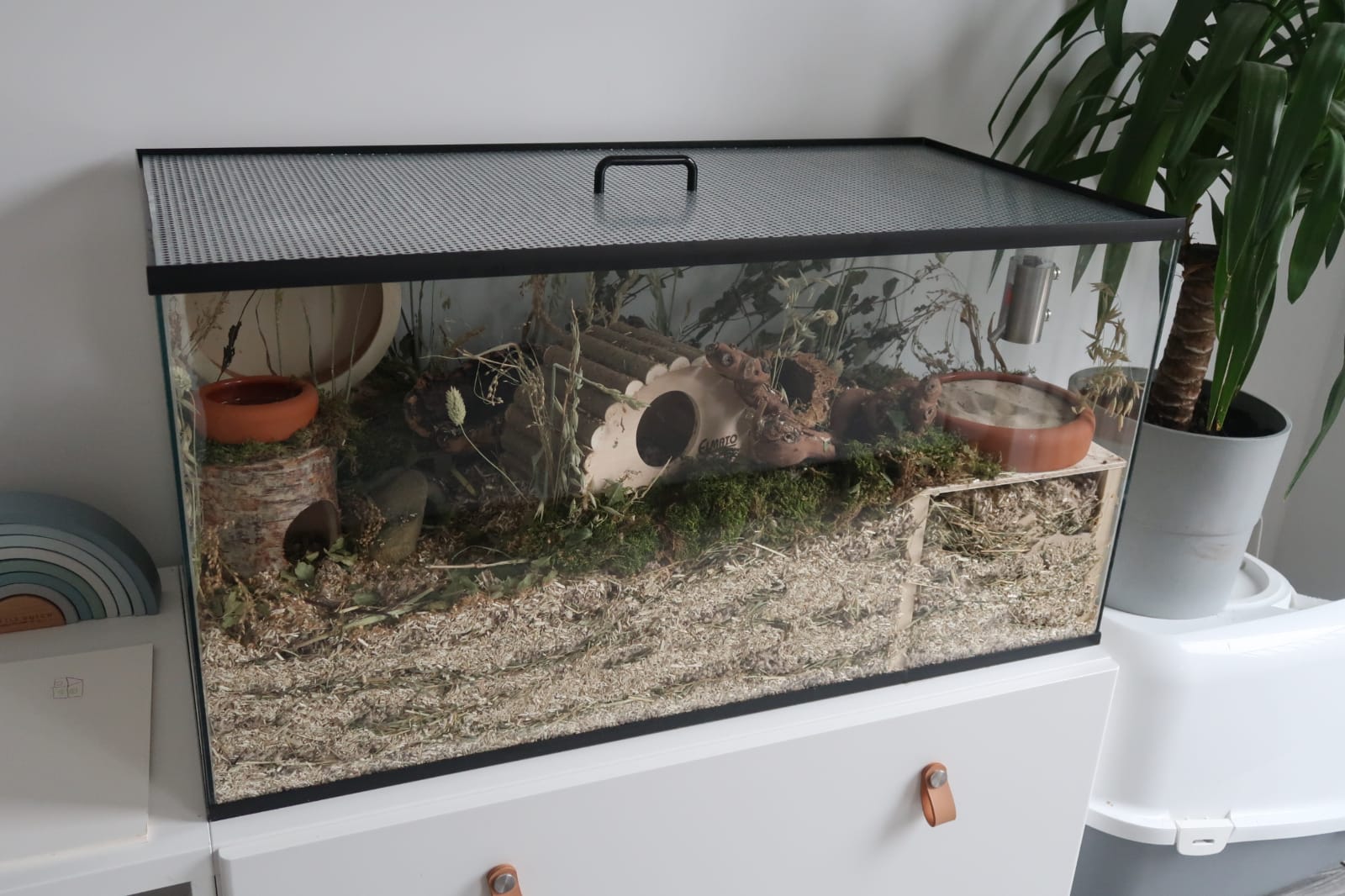 Afmetingen: 90x45x45 ( lxbxh ) Afneembaar deksel van RVS Alle profieltjes zijn beschermd tegen het knagen Vrij gemaakt van overtollige kitranden zodat de Gerbils die ook niet weg kunnen knagen