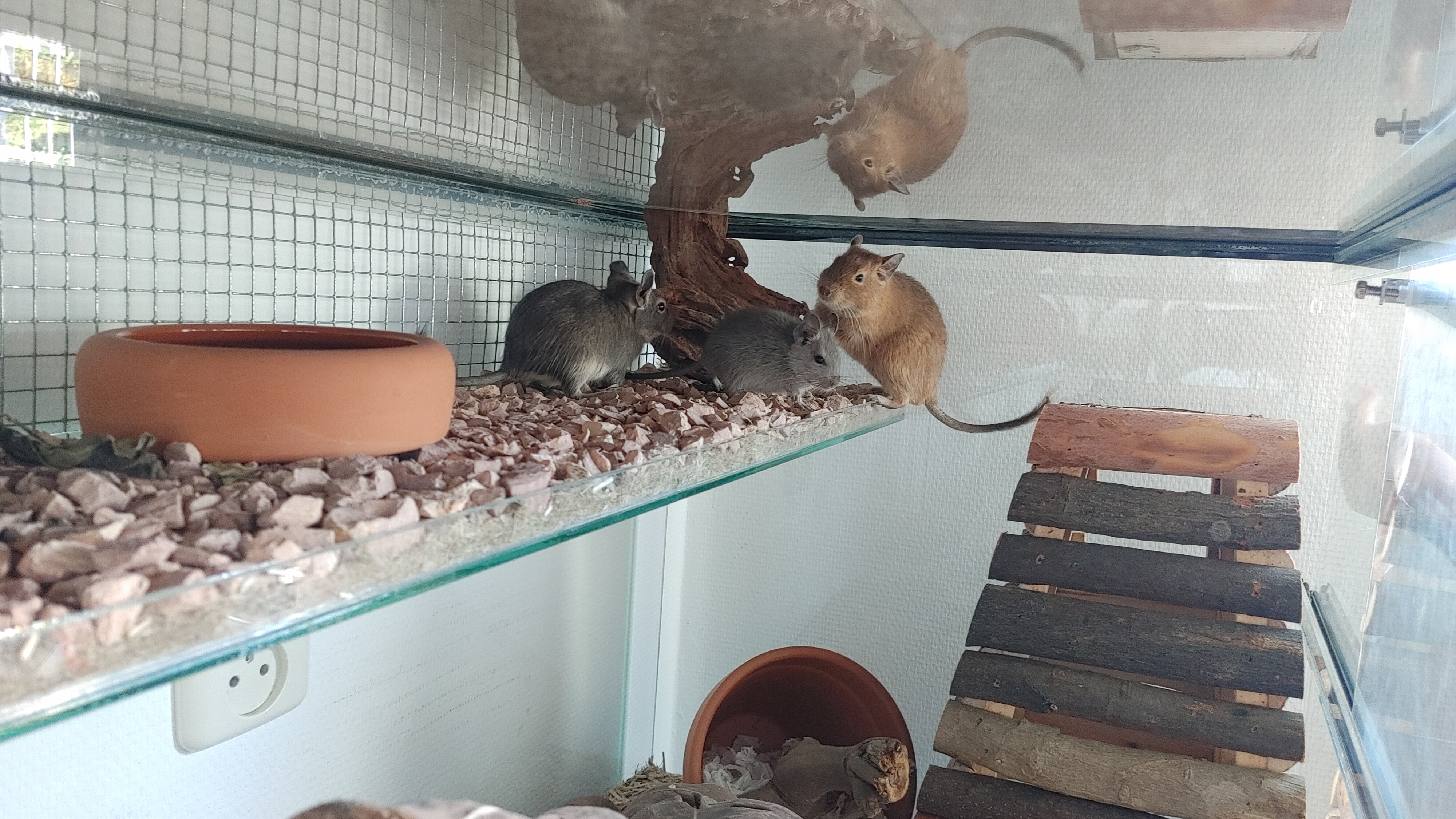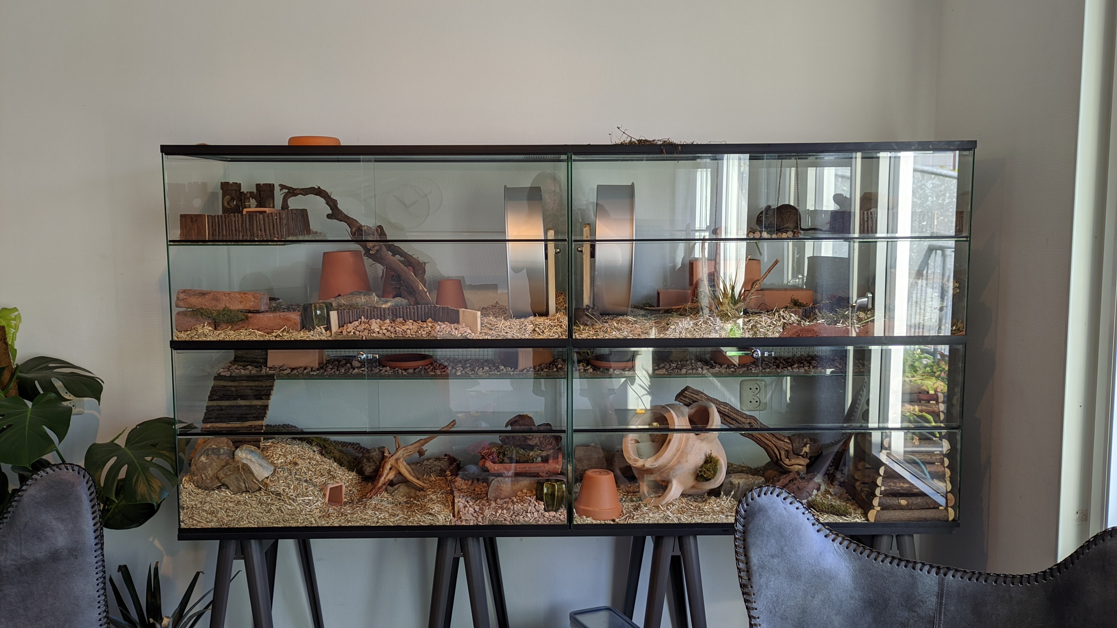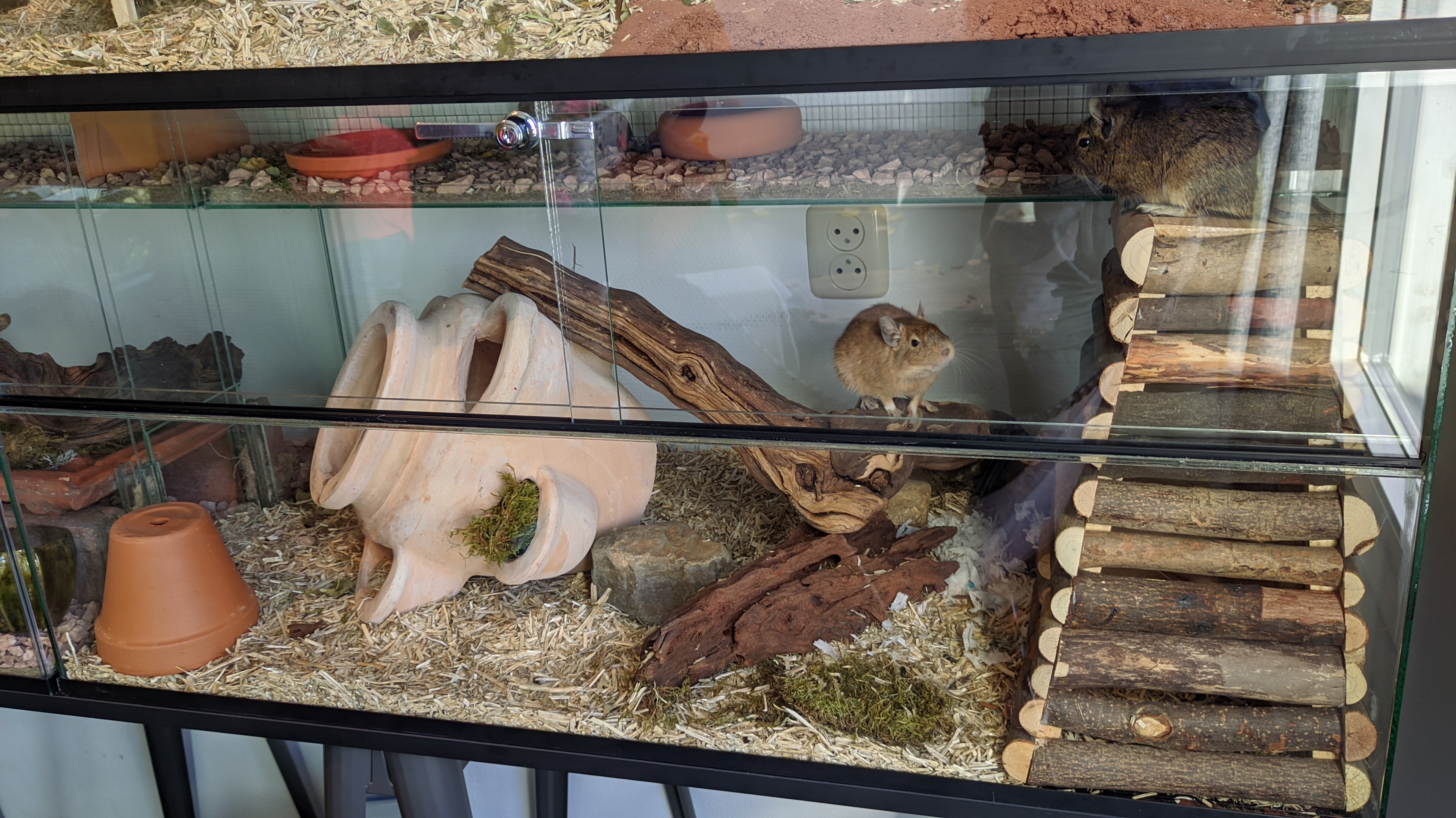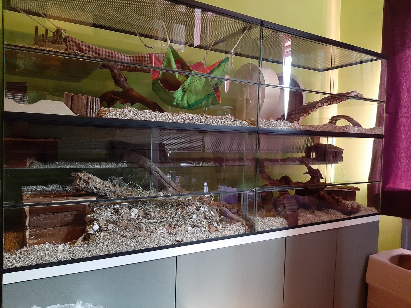 Dit Degoe Terrarium 200x50x100 is een mega villa voor Degoes of andere knaagdieren zoals Ratten, Chinchilla's en of kleinere knaagdieren zoals Gerbils en muizen. Met een zeer riante afmeting van 200x50x100 is er zo ontzettend veel beschikbare ruimte dat hier meerdere Degoes in kunnen leven. Het geheel bestaat uit 4 Terrarium / Gerbilarium die met elkaar in verbinding staan. De 2 basiselementen onder staan met elkaar in verbinding door middel van een luik. Goed te zien op foto 2 en foto 5. De 2 enorme Dego Terrerarium daar bovenop zijn opzetstukken met schuifruiten en plateaus. Via het basiselement onder kunnen de Degoes naar de hoger gelegen oorden. Dat maakt dit Terrarium ook geschikt voor Chinchilla's die graag klimmen. Doordat er gebruik is gemaakt van opzetstukken betekent dit in de praktijd dat er extra loopruimte is. Er zijn namelijk 2 bodems waarover de dieren kunnen lopen met de nodige vierkante centimeters aan ruimte. De basis elementen zijn voorzien van ventilatiestroken zodat de lucht en ventilatie in de onderste 2 verblijven ook dik in orde zijn.