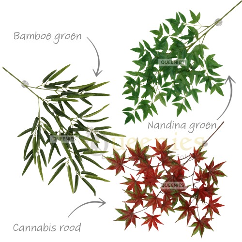 3 verschillende zeer realistische hangende kunstplanten van verschillende 'soorten'. De groene bamboe kunstplant heeft lange dunne pladeren, waar de Nandina hangende kunstplant meer kegelvormige bladeren heeft. De rode cannabis kunstplant heeft de excentrieke sterachtige vorm. Alle 3 de verschillende soorten decoratieve hangplant zijn makkelijk te buigen en te bevestigen aan het glas door middel van de meegeleverde zuignappen ( 2 stuks ) . Uiteraard zijn ze ook kleiner te knippen zodat het mooi in het insecten terrarium past. 1 plant is meer dan voldoende om het spinnen terrairum ruiterlijk mee in te delen.