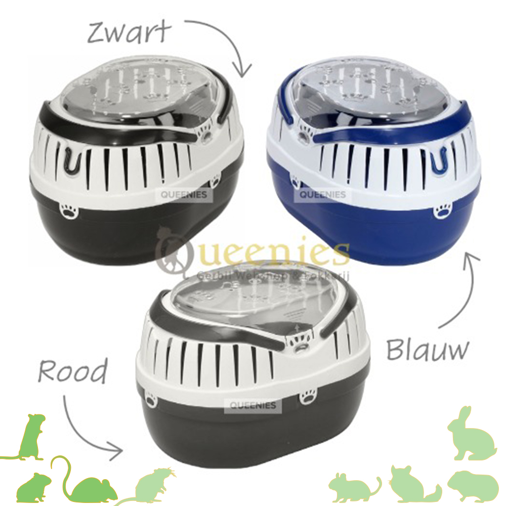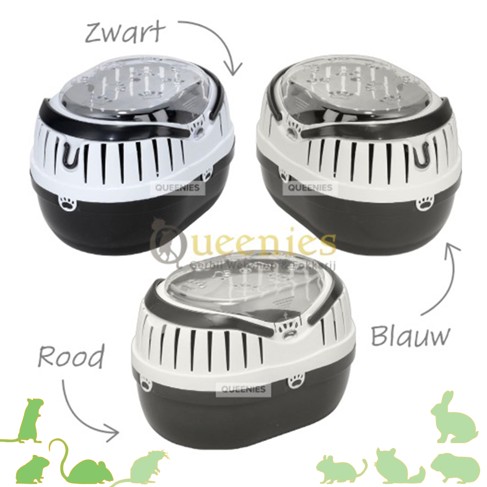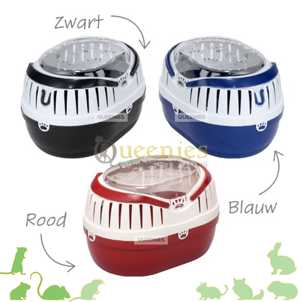 Afmetingen: ( L x B x H ) 28 x 20 x 18 Kleuren: Blauw │ Rood │ Zwart Geschikt voor: Kleine Knaagdieren zoals Gerbils, Dwerghamster, Syrische Goudhamster, Muizen en kleine Ratten. Voor volwassen ratten zal deze 28 cm Transportbox te kleine zijn. Neemt u dan de 35 cm variant.