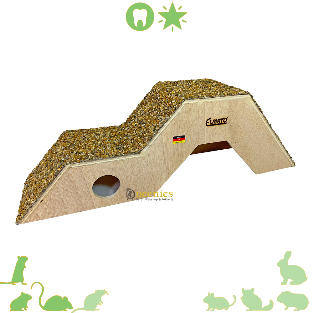 Dit unieke kiezelstenenhuis is een ware eyecatcher en tegelijkertijd een uitdaging voor je dier(en). Het gehele dak van dit huis is bedekt met kiezelsteentjes en daardoor ideaal om op te klimmen en aan te krabben. De dieren ervaren iets totaal nieuws onder hun pootjes en slijten ook nog hun nagels. Door de langwerpige vorm geeft het je dieren een veilig gevoel. Het bootst zowel een tunnel als uitkijkpunt na. Binnenin kunnen de dieren heerlijk tot rust komen door het verlaagde stukje dak. Het huis heeft 4 in- en uitgangen waardoor het huis op diverse manieren in het verblijf kan worden geplaatst. In de vloer zit heen bodem.