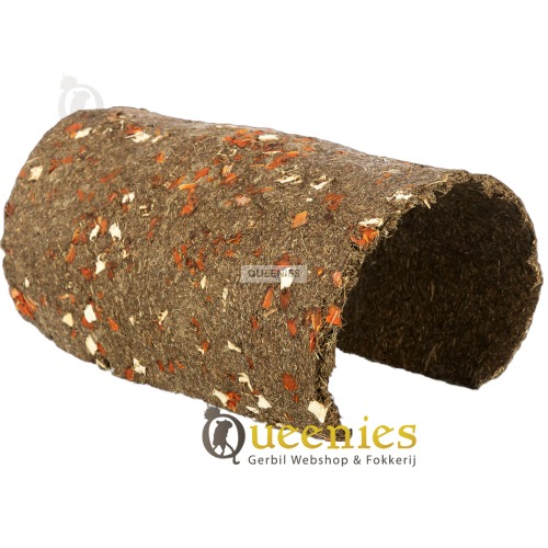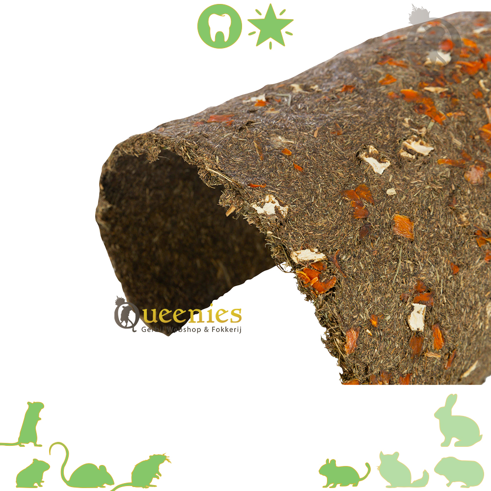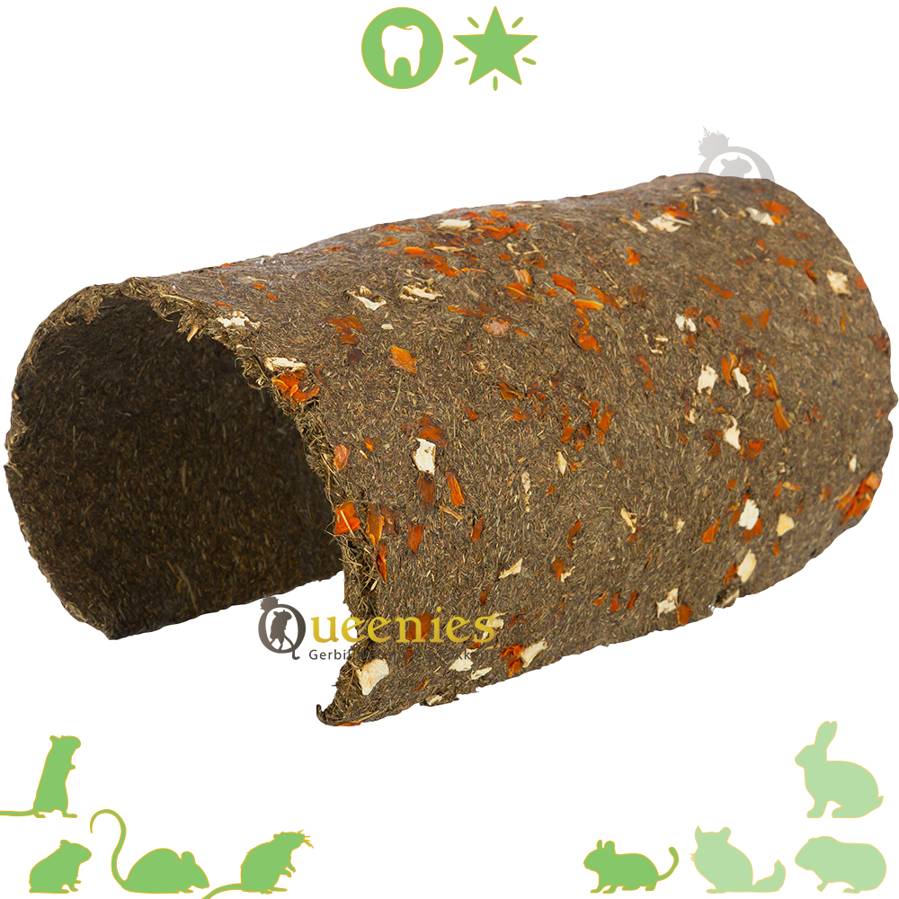 Deze Grot van hooi is een verwennerij die verrjikt is met gedroogde groente zoals wortelen en pastinaak. Deze natuurlijke grot kan volledig opgegeten worden en is daarom uiterst geschikt voor Knaagdieren en heel misschien ook Cavia's. Hoewel het laatste pas van toepassing is als de Cavua echt klein is en of zelfs nog jong is. De tunnel heeft een perfecte afmeting voor Knaagdieren zoals Gerbils, Goudhamsters, Degoes en Muizen. Deze grot kan ook gebruikt worden als ondergrondse tunnel die gegraven tunnelsystemen van Gerbils in tact houdt. Wanneer de Gerbil een mooi tunnel heeft gegraven en deze tunnel tegenkomt tijdens het graven heeft hij direct een mooie versnappering te pakken. De tunnel is gemaakt van 100% natuurlijke materialen zonder onnatuurlijke toevoegen.