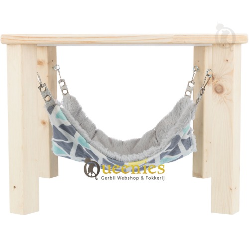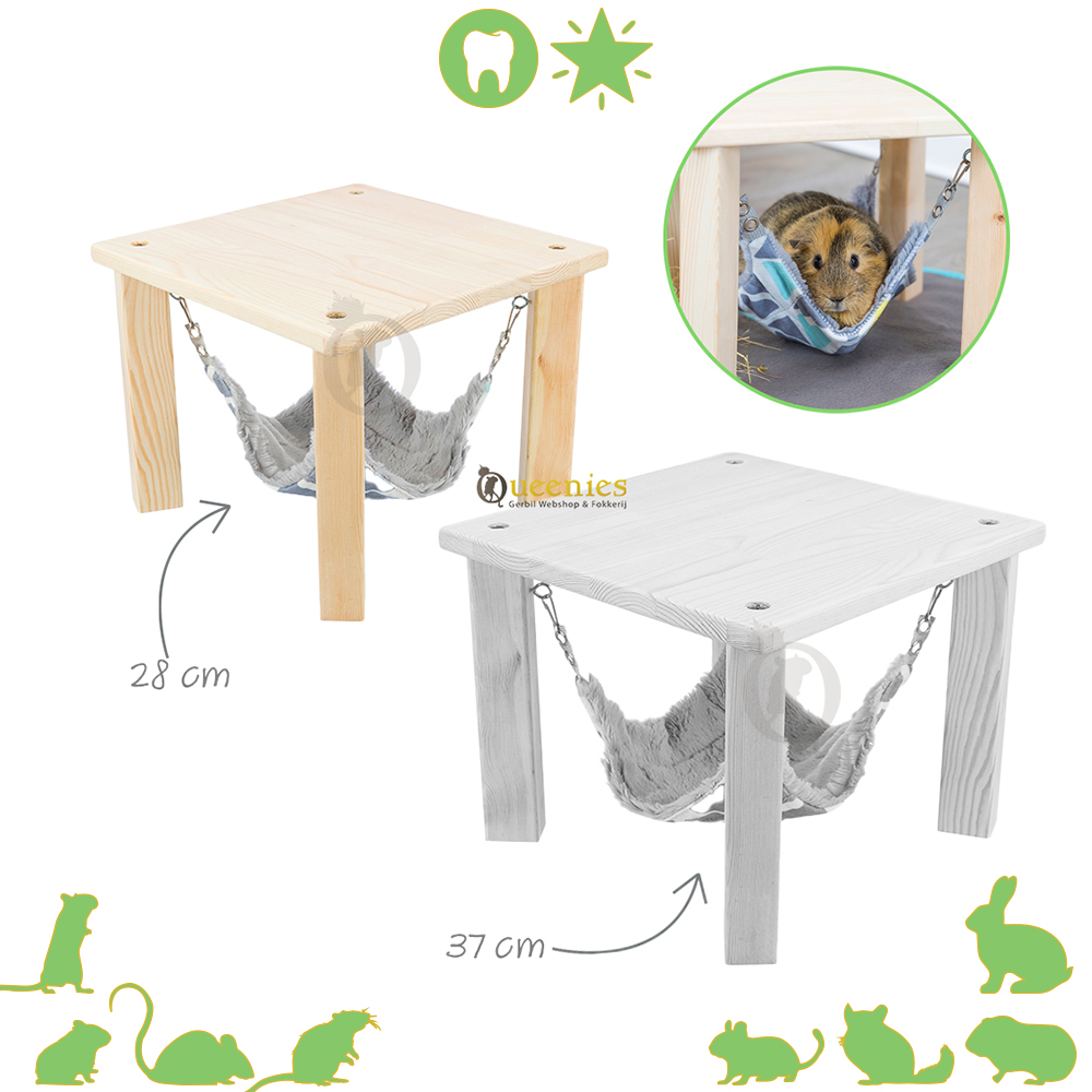 Afmetingen: 28 x 28 x 24 cm│37 x 37 x 29 cm Materiaal: Blank hout zonder schors en een zijdezachte hangmat Geschikt voor: Knaagdieren en Dwergkonijnen