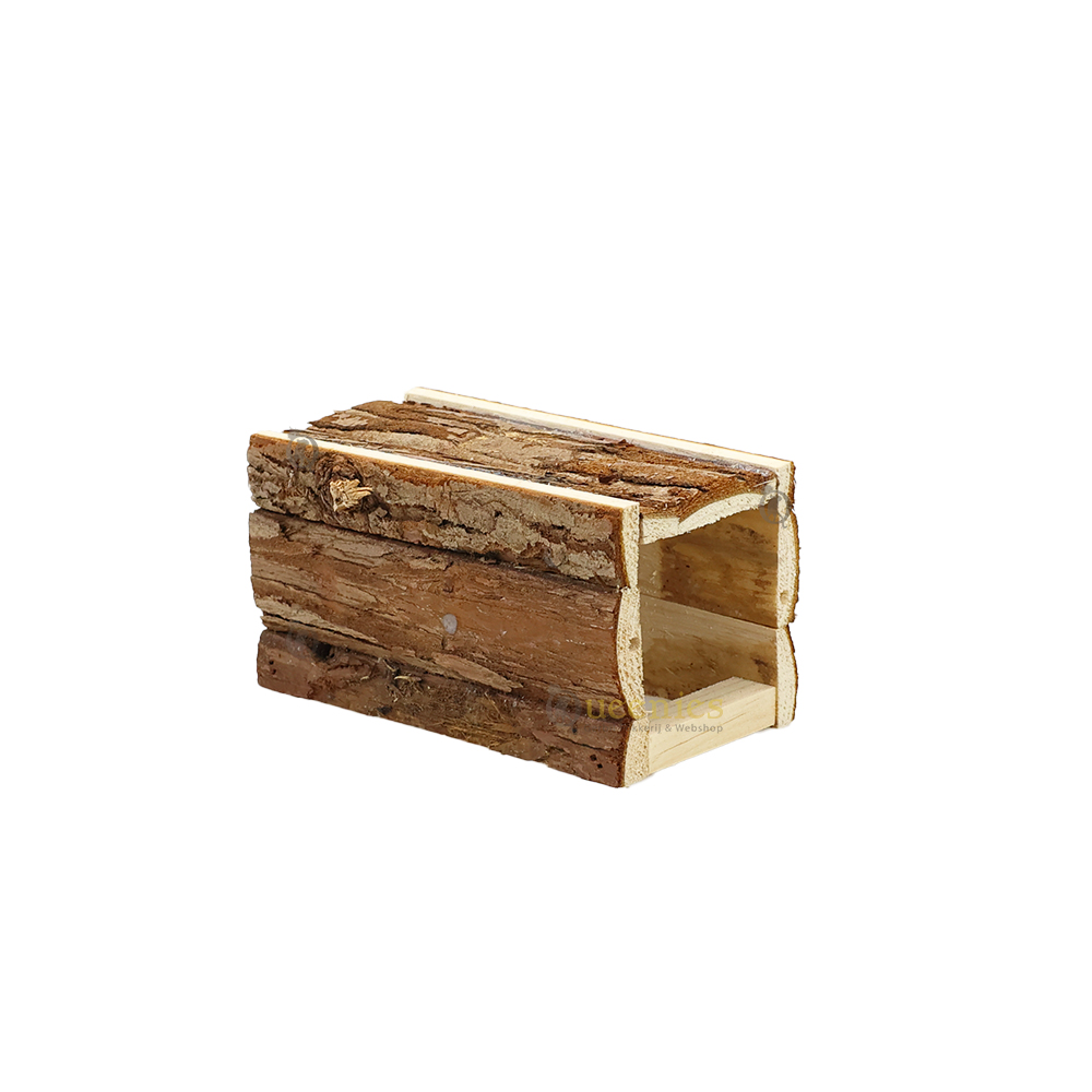 De grove structuur van schorshout geeft deze tunnel een authentieke uitstraling die mooi combineert met andere natuurlijke accessoires. Waar ronde tunnels soms wegrollen, blijft dit model stabiel staan. Dat maakt het zowel praktisch als decoratief binnen hamsterscapes of gerbilverblijven.