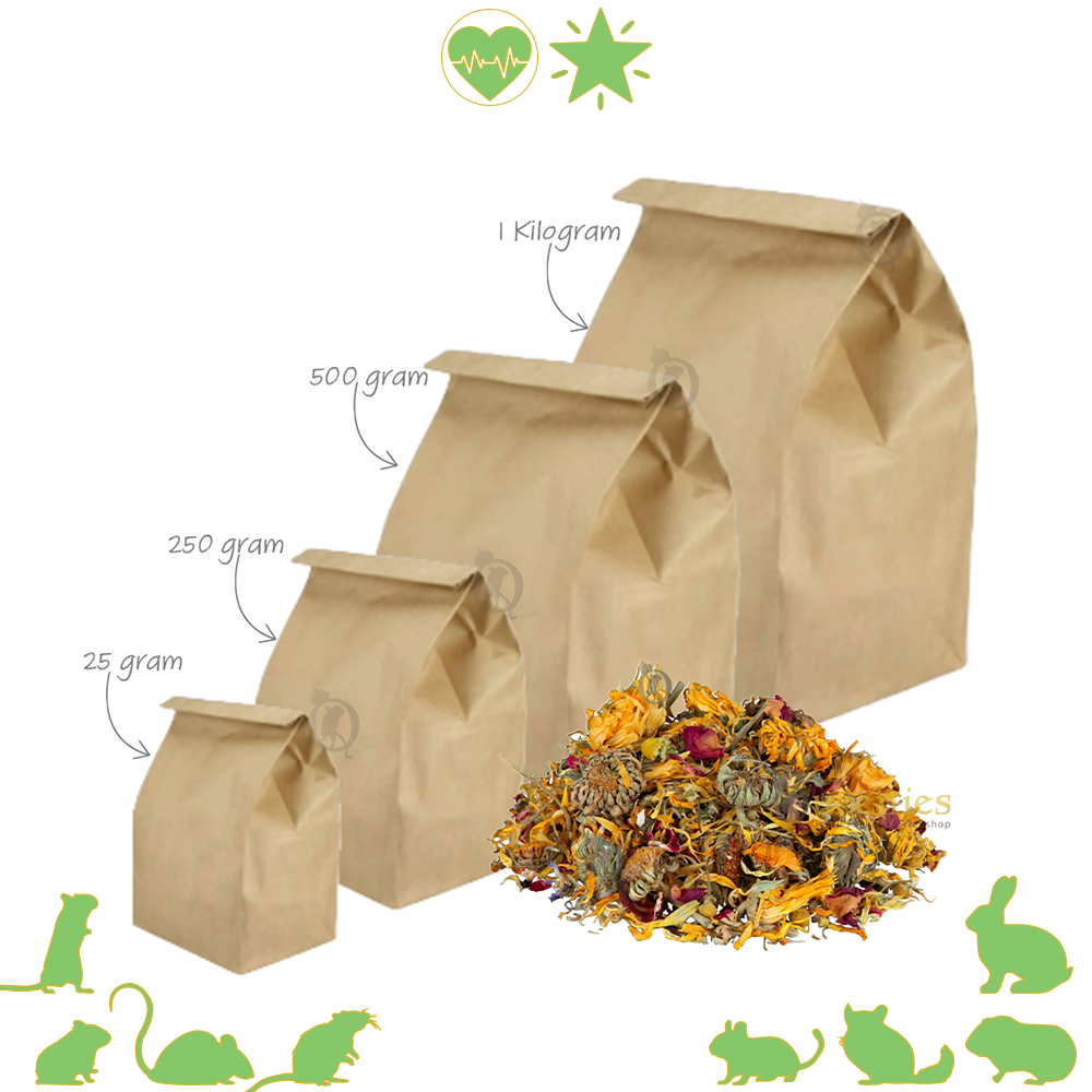Samenstelling: gedroogde korenbloem, goudsbloem, kamille, rode klaver, hibiskus, roos- en zonnebloemblaadjes.